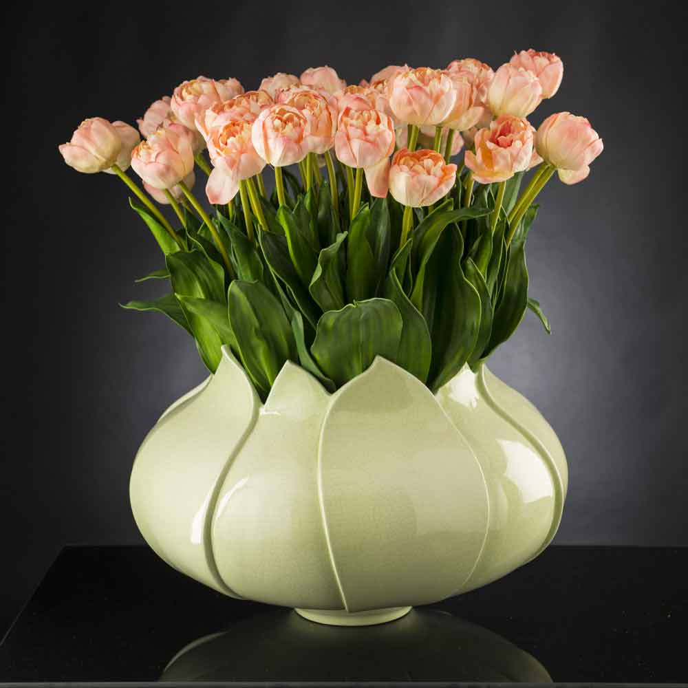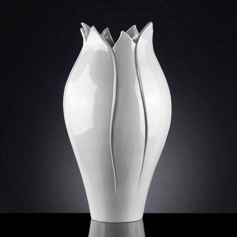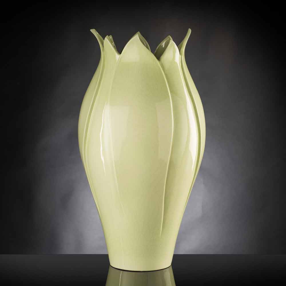 Indoor-Vase aus farbiger Keramik, handgefertigt in Italien. Ein besonders elegantes Design, das an die Formen einer Tulpe erinnert und eine exklusive Ergänzung mit einer zarten Ästhetik bietet. Die Verwendung von Keramik und die handwerkliche Herstellung durch erfahrene Handwerker der Branche unterstreichen und steigern deren Wert und Qualität für ein Ergebnis, das in jedem häuslichen und nicht häuslichen Raum ein echtes Kunstwerk darstellen kann. Ein idealer Stil für die unterschiedlichsten Umgebungen, von der Wohnungseinrichtung bis hin zu Hotels, Restaurants, Objektbereichen, Spas, aber auch als Rahmen für Veranstaltungen und Hochzeiten.