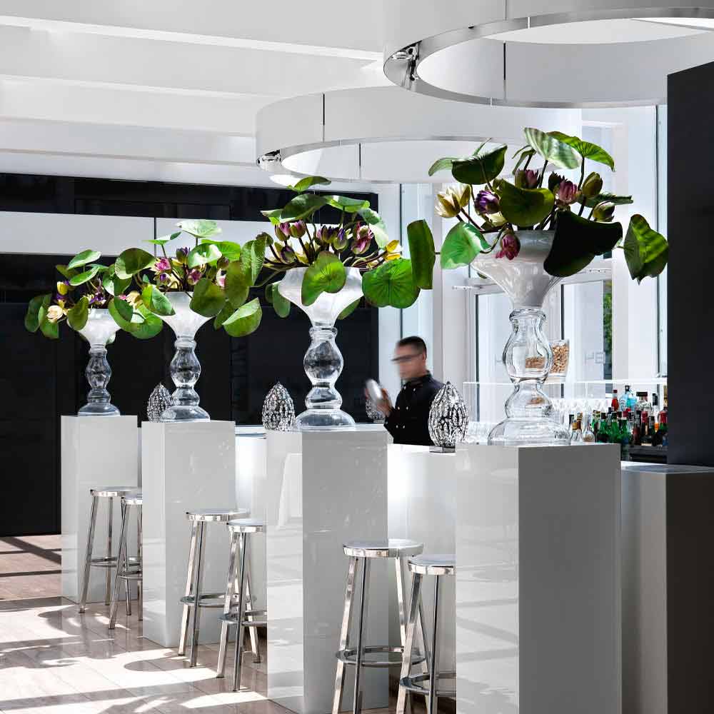 Ziervase für den Innenbereich aus weißem Glas mit transparentem Boden, hergestellt durch eine 100% Made in Italy Verarbeitung . Eine moderne Ergänzung, deren Ästhetik Raffinesse ausdrückt, indem sie eine schlanke Figur mit weichen und geschwungenen Formen vorschlägt, perfekt für die Einrichtung und Vervollständigung von Umgebungen mit einem exklusiven Stil, auch dank der zeitlosen Eleganz von Glas, einem hochwertigen Material von hohem Wert . Ein ideales Design für die unterschiedlichsten Umgebungen, von der Wohnungseinrichtung bis hin zu Hotels, Restaurants, Objektbereichen, Spas, aber auch als Rahmen für Veranstaltungen und Hochzeiten.