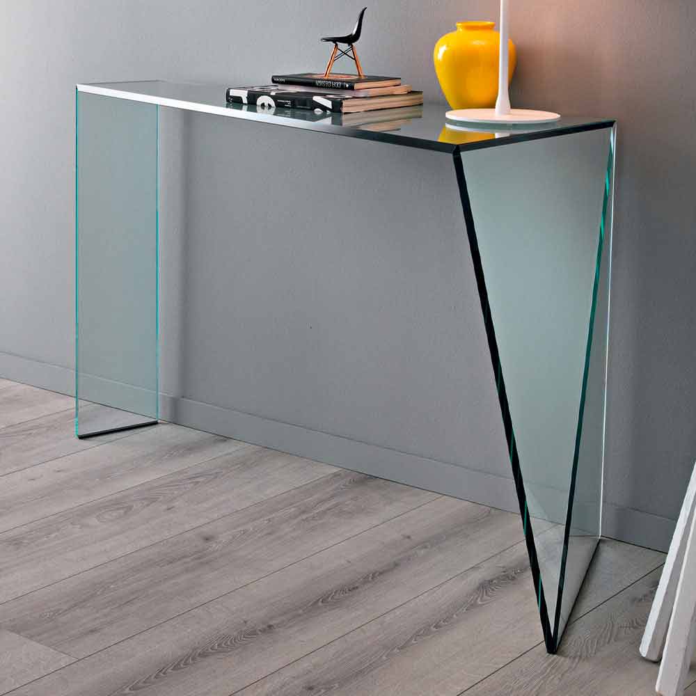 Rosalia ist ein raffinierter Wohnzimmer-Konsolentisch , der in Italien von Hand aushochwertigen Materialien hergestellt wurde . Komplett aus extraklarem Glas (Dicke 15 mm). Sein Hauptmerkmal ist das seitliche Schrägschweißen.