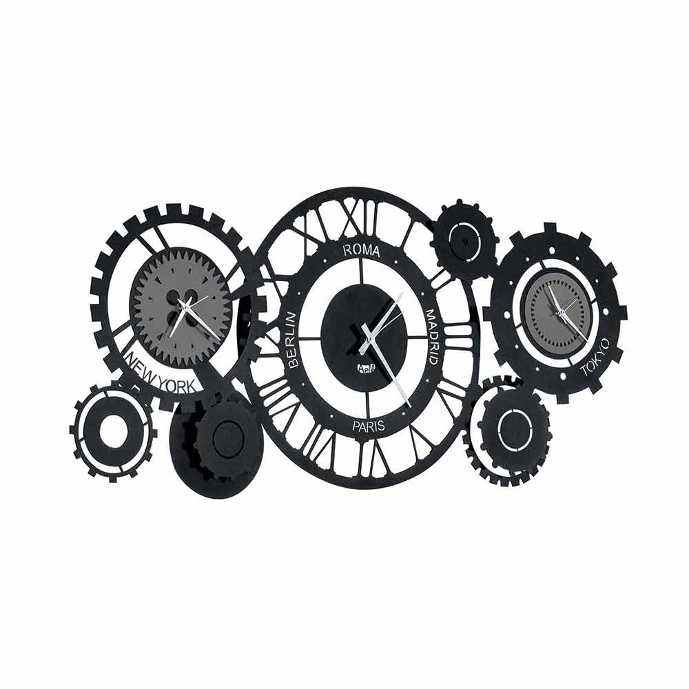 Meccanico ist eine Wanduhr mit einem besonderen und großstädtischen Design, die dank der drei Zeitzonen Ihren Räumen Stil und Funktionalität verleiht.