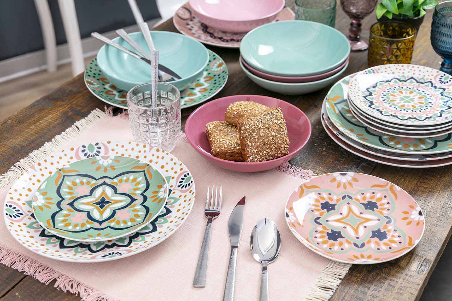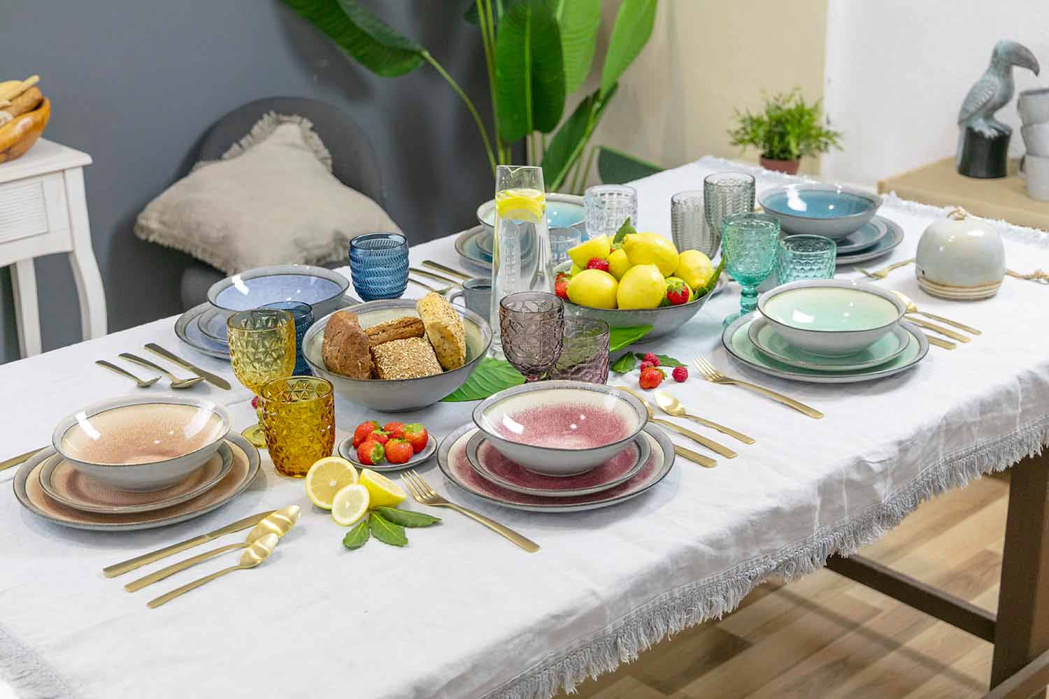 Eine einzigartige und unnachahmliche Brillenlinie. Jedes Glas verkörpert sich mit seiner eigenen Farbe und Dekoration , als ob es sich voneinander unterscheiden möchte, und unterstreicht noch mehr die Einzigartigkeit jedes Gastes, der auf andere Weise an der Geselligkeit teilnimmt. Eine moderne und faszinierende Atmosphäre, die intensiven Farben und der Filz verstärken die geometrischen Formen auf der Oberfläche und machen das Gerät zu einem wertvollen Accessoire, das seinesgleichen sucht. Das Sitzen am Tisch wird so zu einem einzigartigen Erlebnis in einer Balance von Formen und Farben, durch die das Set zum Leben erweckt zu werden scheint.