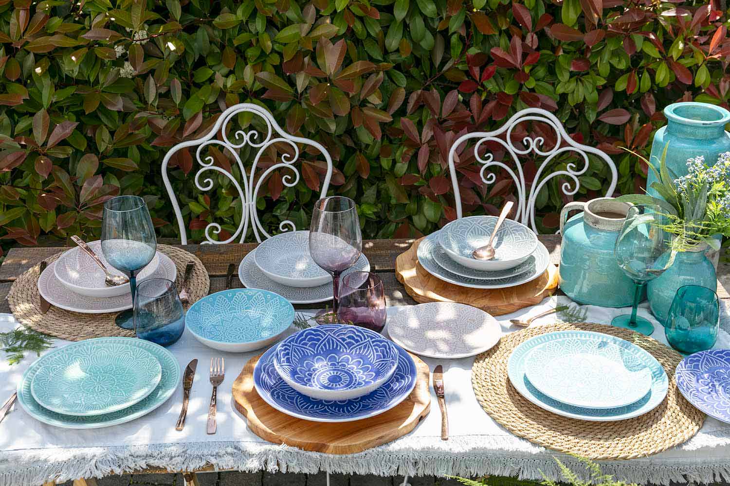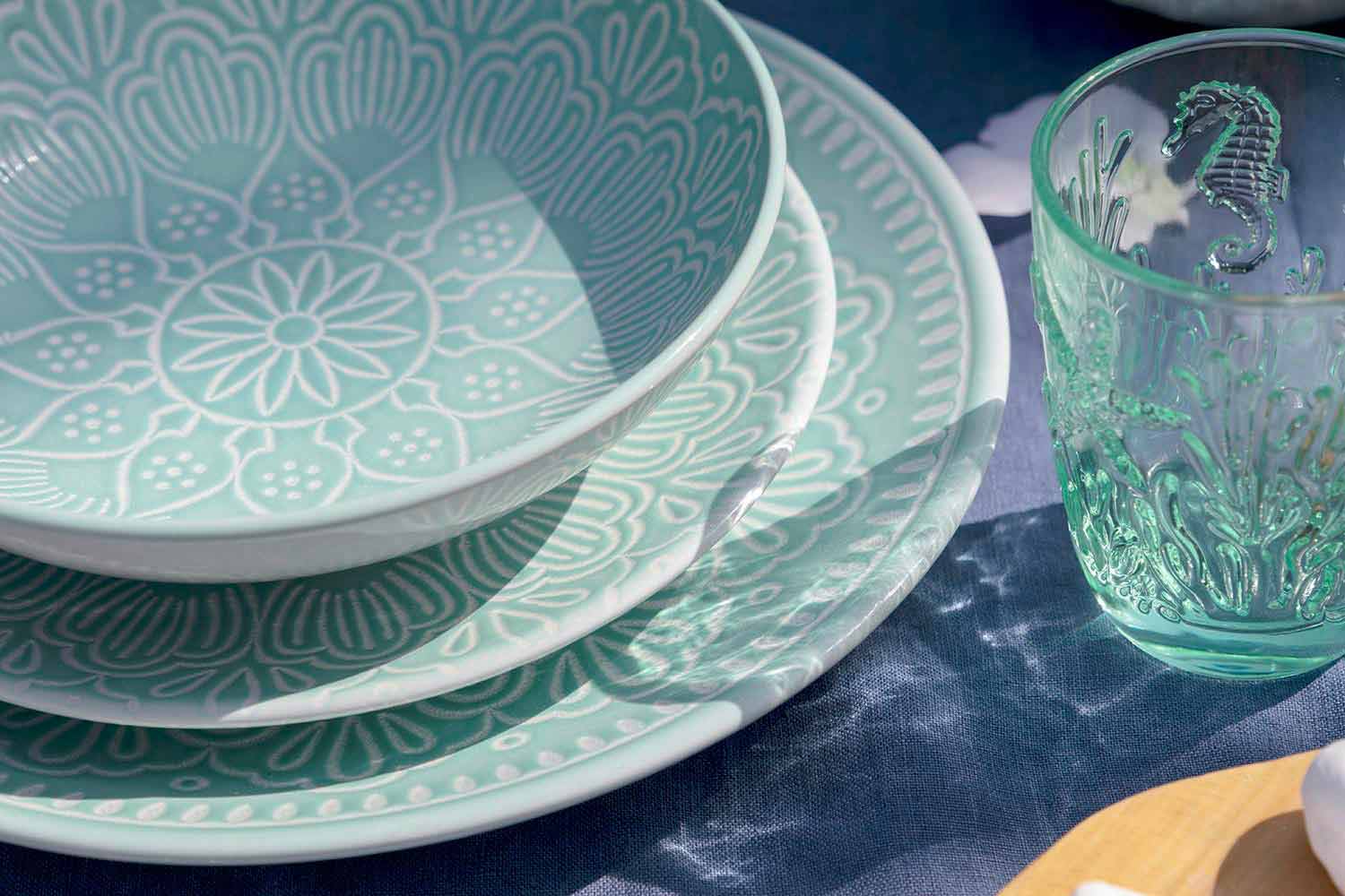 Set aus farbigem und modernem Steinzeug mit 18-teiligem Designgeschirr.