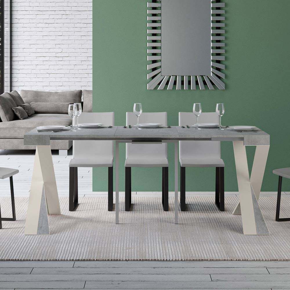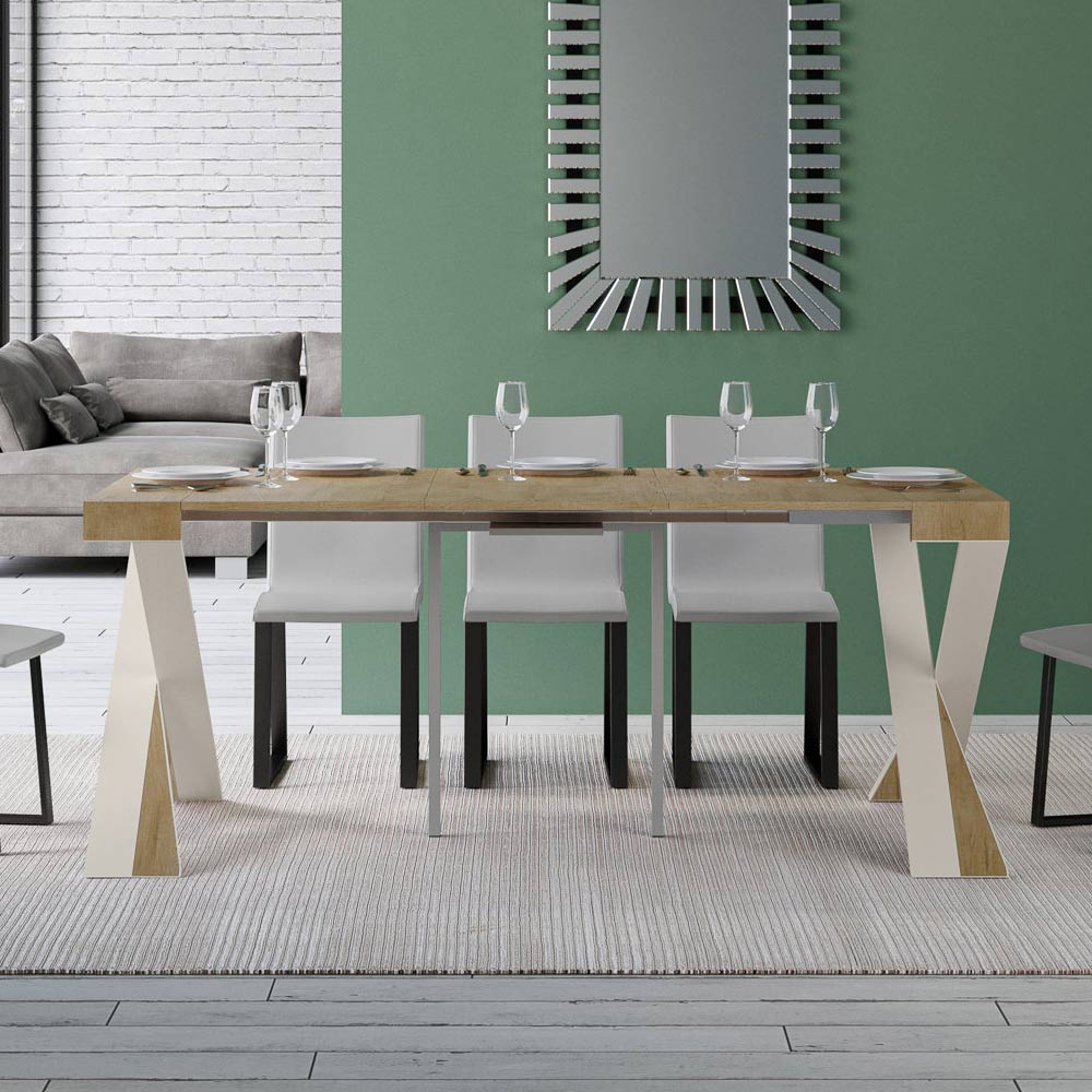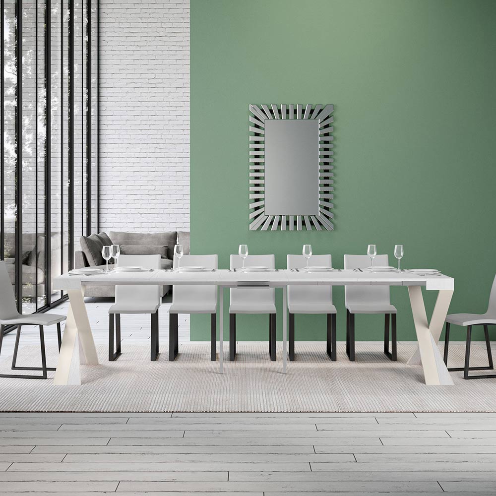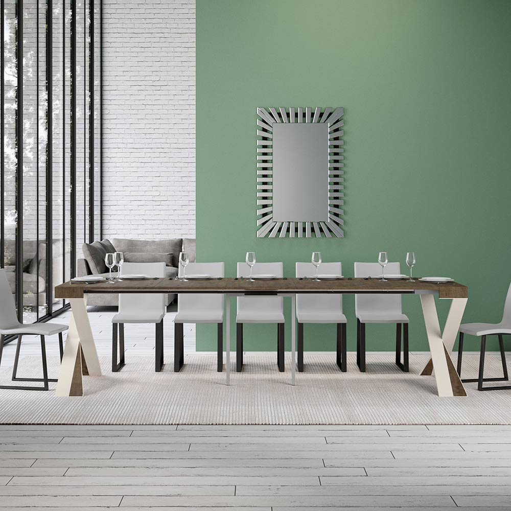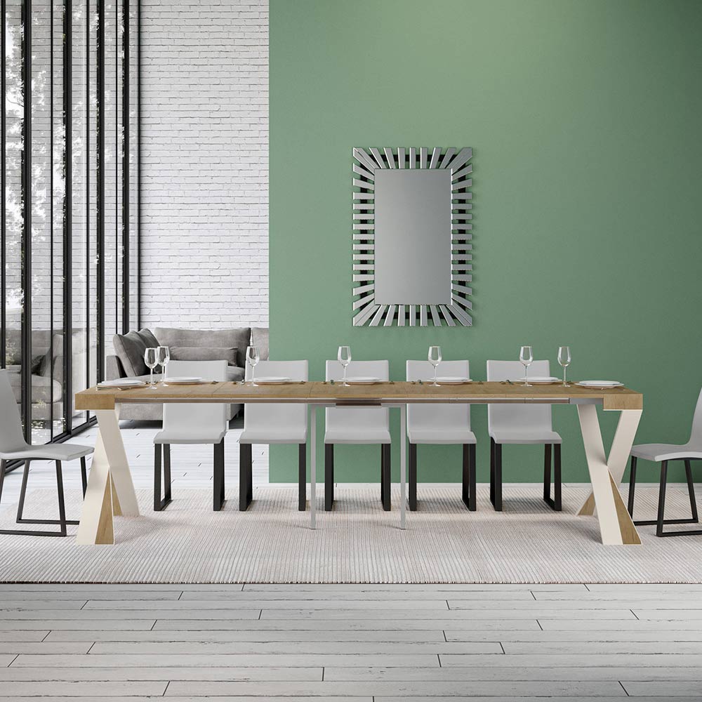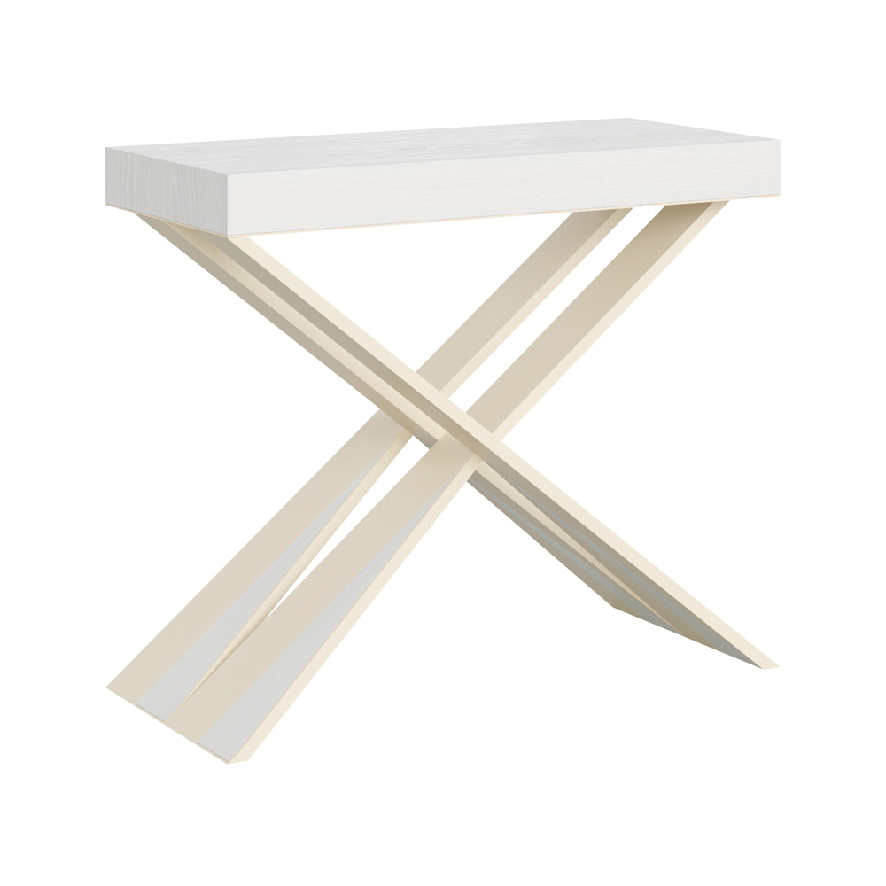 Dieser ausziehbare Konsolentisch verkörpert Eleganz und Funktionalität in einem aufsehenerregenden Design. É hat eine moderne Silhouette mit einem X Sockel, der nicht nur einen soliden Halt bietet, sondern auch einen Hauch von raffinierter Originalität verleiht. Die Platte aus Möbelholz ist eine Hommage an die Qualität von Made in Italy, die für ihre Langlebigkeit und ihre Fähigkeit, den Lauf der Zeit zu überdauern, geschätzt wird.