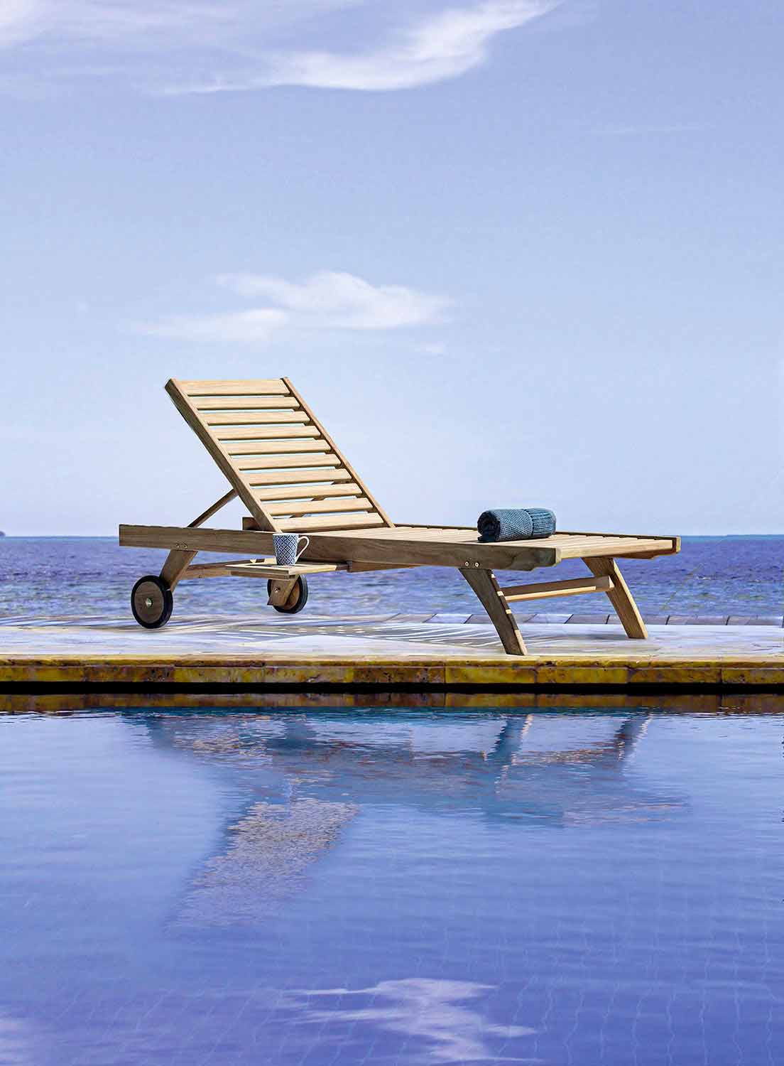 Sonnenbank im Freien mit Rädern, Liege- und Ablagefach aus Teakholz.