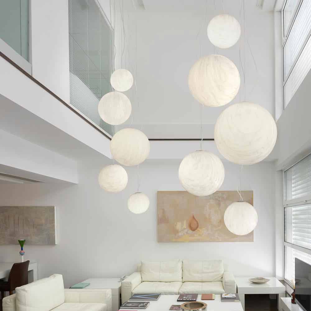 Er kann sowohl als einzelner Kronleuchter als auch als Komposition aus Kugeln unterschiedlicher Größe verwendet werden, um ihn in einen großen modularen leuchtenden Drehpunkt mit einer Rosette für fünf Mineral-Lampen zu verwandeln, die separat erhältlich sind.