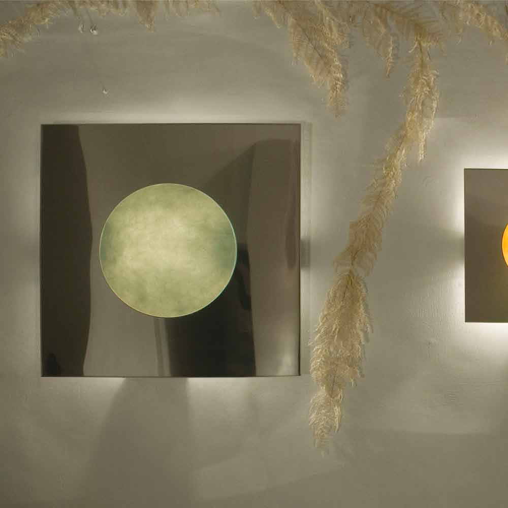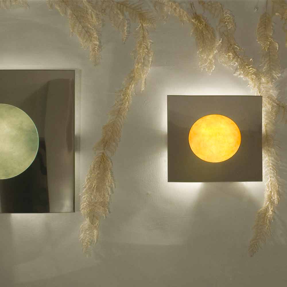 Ein wahres Kunstwerk aus poliertem Stahl und Nebulite, einem Material aus Harz und Fasern, dessen Adern der Lampe einen besonderen Mondeffekt verleihen. In zwei verschiedenen Größen und in sechs verschiedenen Farben erhältlich: Farben: - weiß; - rot; - orange; - Türkis; - Magenta; - blau