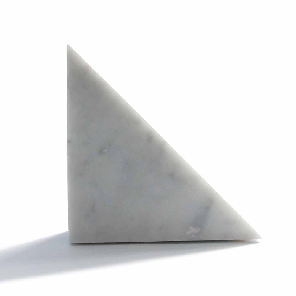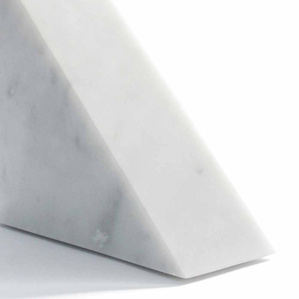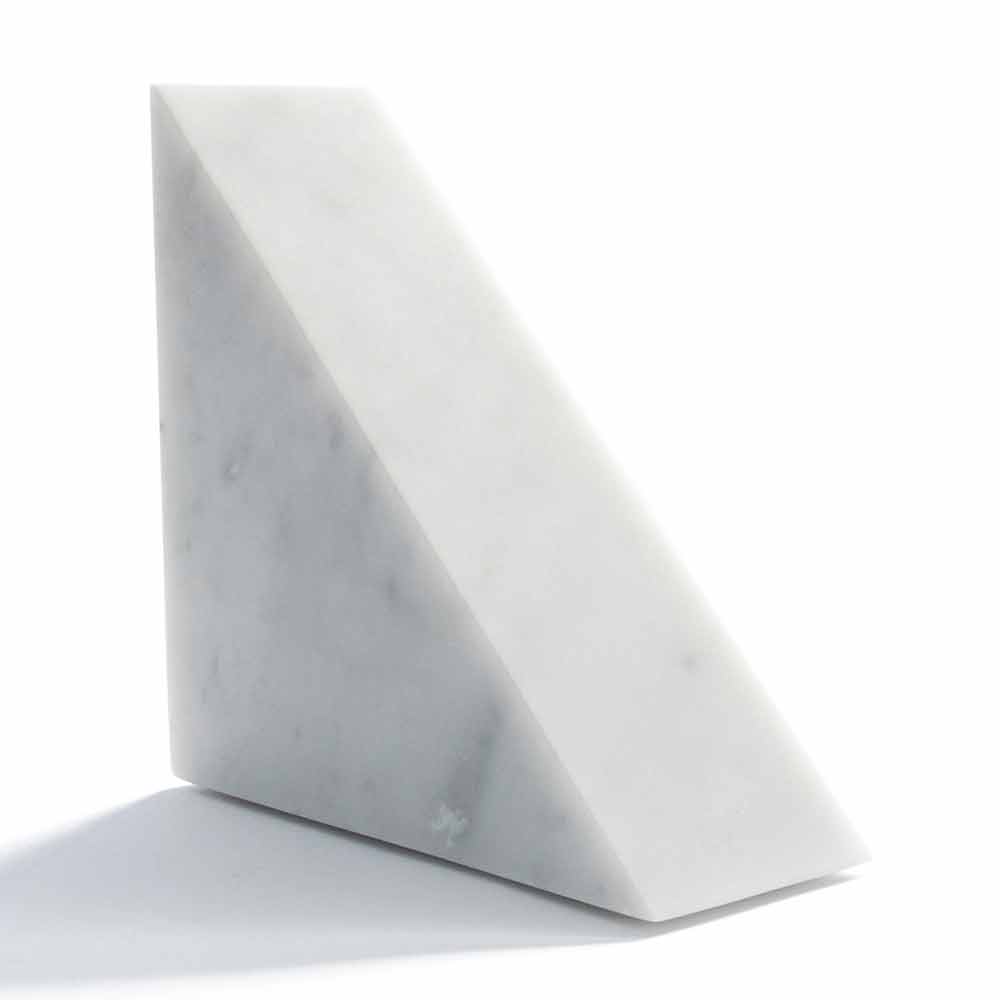 Dreieck Design Buchstütze aus satinweißem Carrara Marmor Made in Italy.