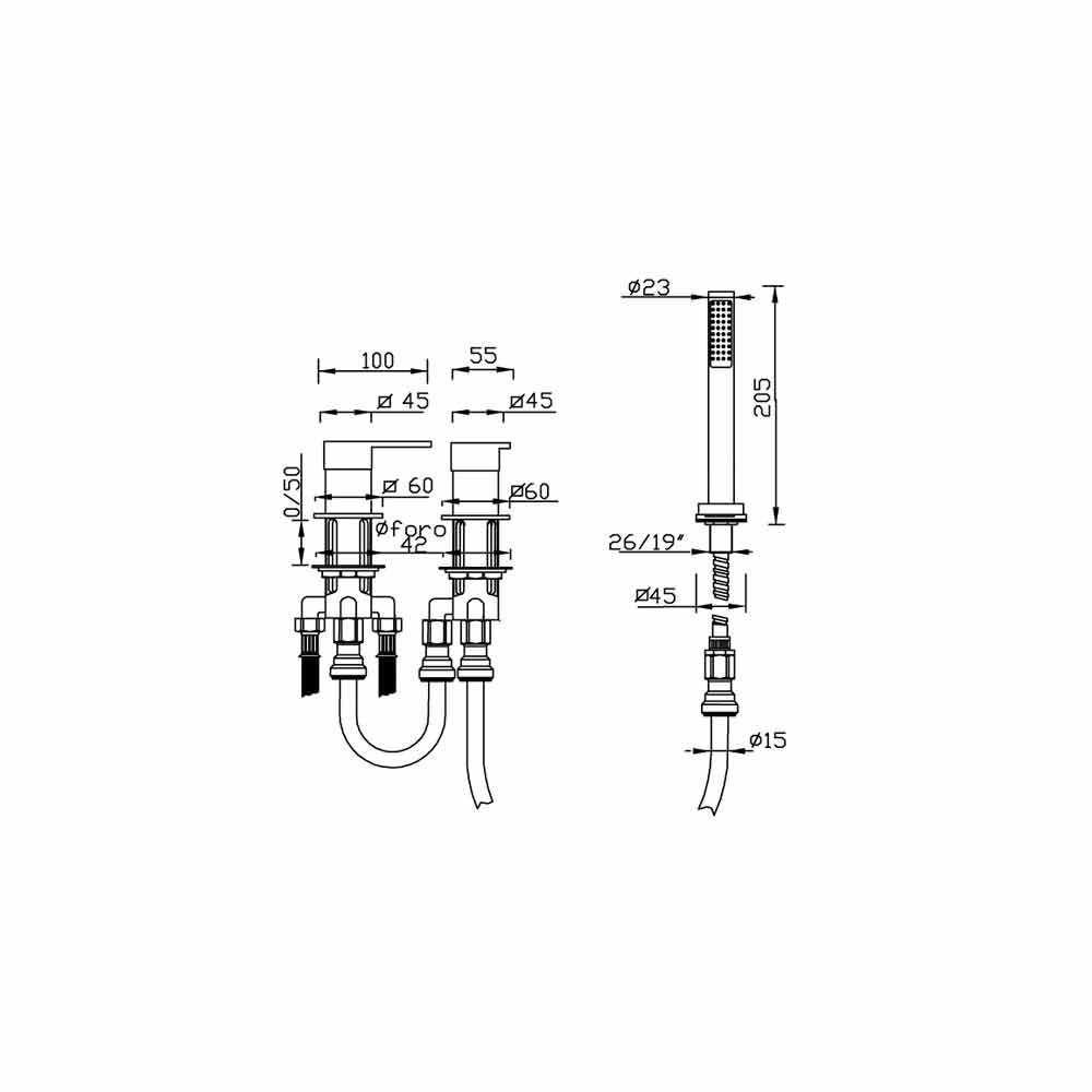 3-Loch Wannenrandbatterie aus Chrom ohne Auslauf und mit Brausegarnitur. Komplett in Italien aus Messing hergestellt; mit hochwertigen Materialien, die den europäischen Standards entsprechen.