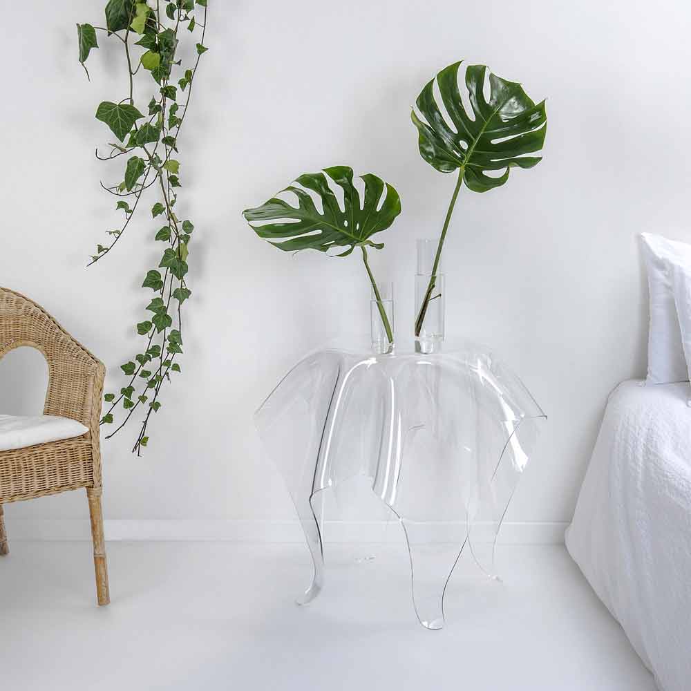 Moderner Beistelltisch aus transparentem Plexiglas Otto, made in Italy Der drapierte Otto Tisch ist ein Unikat, ein Werk moderner Kunst. Eine Platte aus reinem 100% reinem Polymer aus transparentem PMMA-Plexiglas wird von Hand bei hohen Temperaturen drapiert, um einen einzigartigen und unwiederholbaren Tisch zu schaffen. Die gebaute Struktur ist völlig selbsttragend. Plexiglas ist stoßfest, nicht verformbar, unveränderbar und wärmeisolierend. Die Helligkeit und Helligkeit werden über die Zeit konstant und unverändert beibehalten. Das PMMA Plexiglas aus reinem Polymer ist ungiftig, hypoallergen, geruchlos und antibakteriell. 100% recycelbar. Die Dimensionen können aufgrund der Kunstfertigkeit des Kunstwerks kleine Abweichungen erfahren. Entworfen, entworfen und hergestellt in Italien, mit italienischen Materialien.