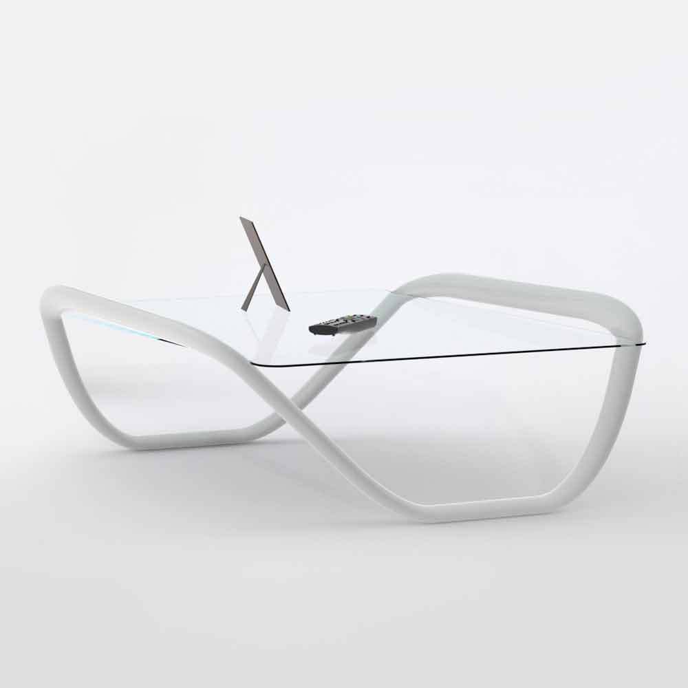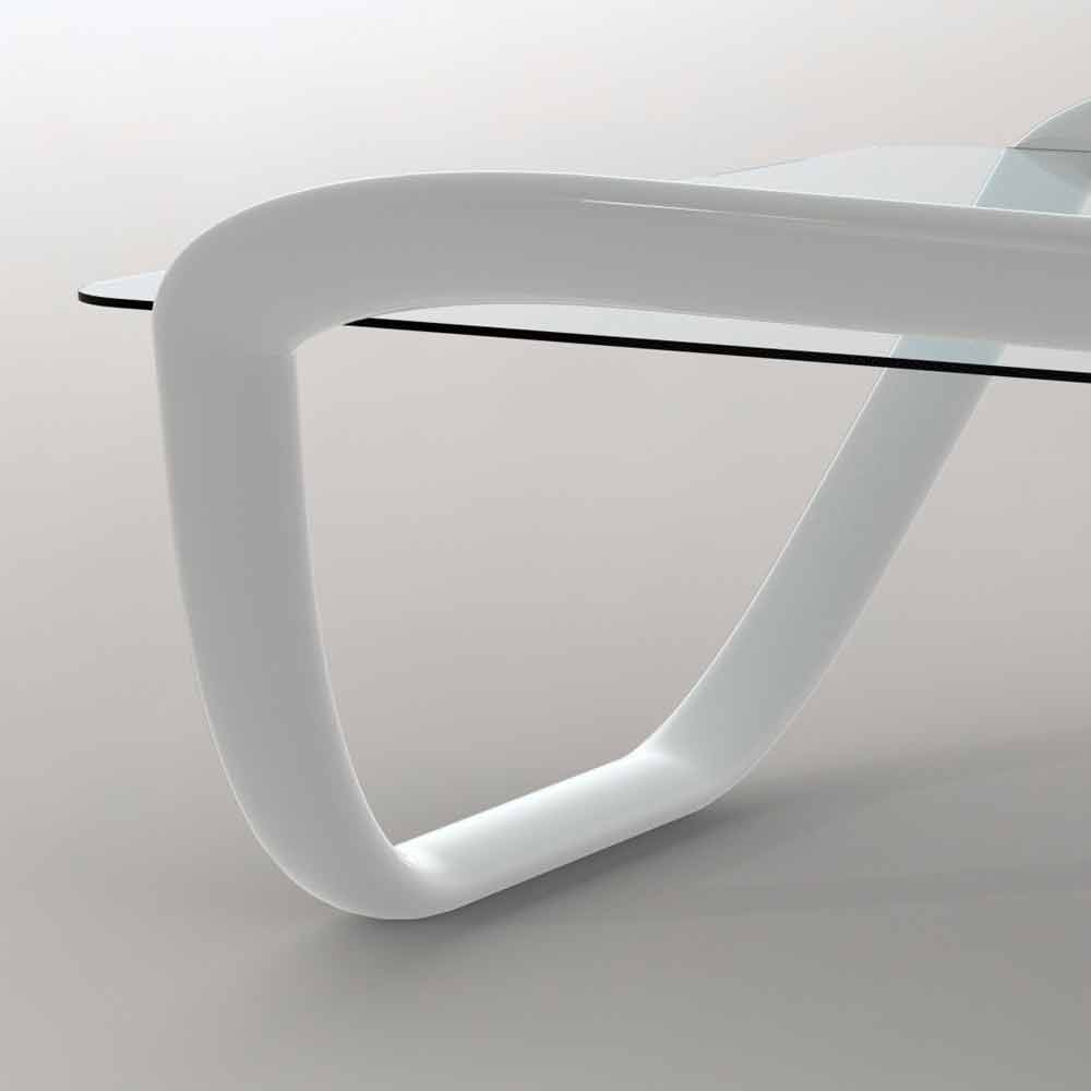 Couchtisch mit Solid Surface-Struktur; für einen Vorschlag, der durch das einfache und suggestive Zeichen einer geschwungenen durchgehenden Linie gekennzeichnet ist. Eine wesentliche formale Lösung, die in der Lage ist, die Umgebung zu personalisieren. Die Transparenz der Glasplatte ermöglicht es, die weichen Linien der Struktur hervorzuheben. Eine einzigartige Form in der Kontinuität des Raums. Ausgestattet mit einer glänzenden / matten weißen Lackierung (RAL9003).