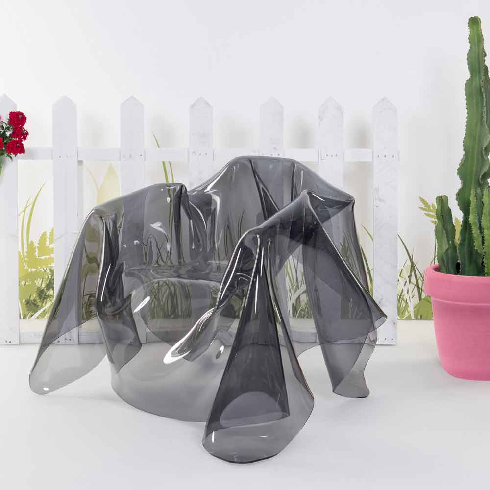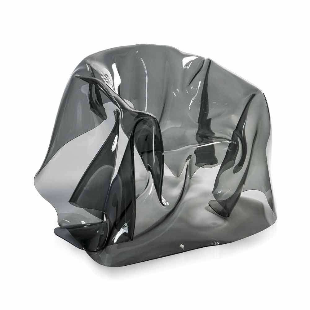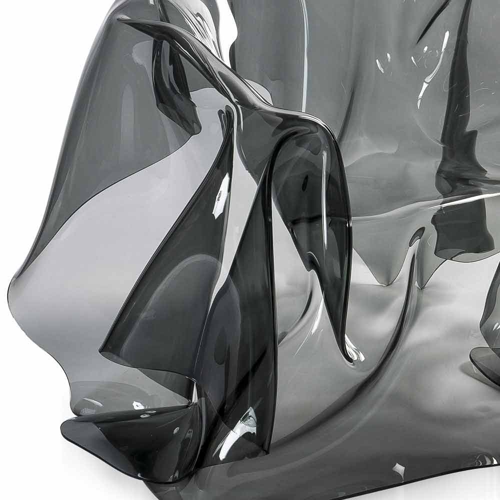 Moderner Design-Sessel aus rauchigem Plexiglas Paris, hergestellt in Italien Der Pariser Sessel mit Drapierung ist ein Unikat, ein Werk moderner Kunst. Aus einer Platte aus reinem 100% reinem Polymer aus PMMA-Plexiglas mit einer von Hand vollständig drapierten Rauchfarbe entsteht ein einzigartiger und unwiederholbarer Sessel. Der Sessel ist völlig selbsttragend und bietet Platz für 1 Person. Die physikalisch-technischen Eigenschaften von Plexiglas (stoßfest, nicht verformbar, unveränderlich, wärmeisolierend) machen diesen Artikel zu einem praktischen und funktionellen Möbelstück, das für jede Umgebung geeignet ist. Die Helligkeit und Helligkeit werden über die Zeit konstant und unverändert beibehalten. Das PMMA Plexiglas aus reinem Polymer ist ungiftig, hypoallergen, geruchlos und antibakteriell. 100% recycelbar. Entworfen, entworfen und hergestellt in Italien, mit italienischen Materialien.