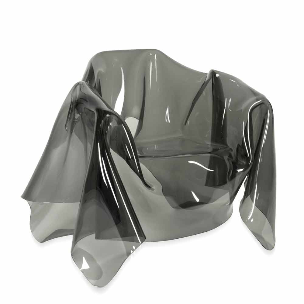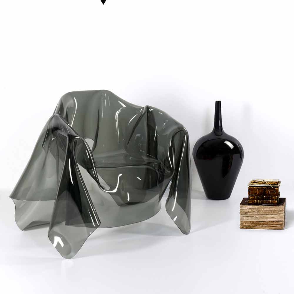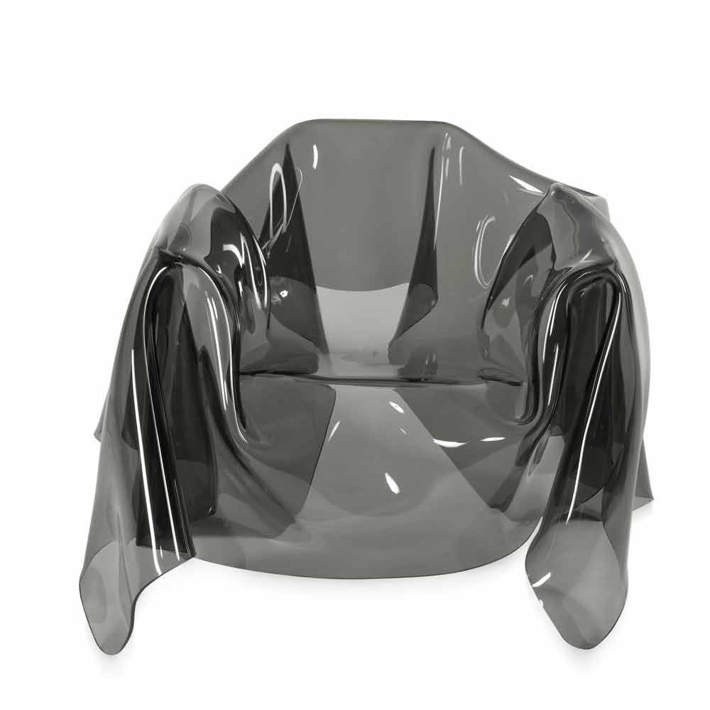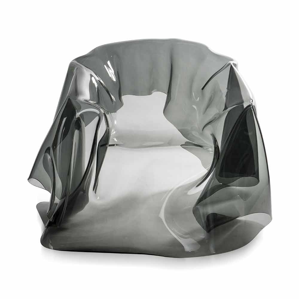 Moderner Design-Sessel aus rauchigem Plexiglas Paris, hergestellt in Italien Der Pariser Sessel mit Drapierung ist ein Unikat, ein Werk moderner Kunst. Aus einer Platte aus reinem 100% reinem Polymer aus PMMA-Plexiglas mit einer von Hand vollständig drapierten Rauchfarbe entsteht ein einzigartiger und unwiederholbarer Sessel. Der Sessel ist völlig selbsttragend und bietet Platz für 1 Person. Die physikalisch-technischen Eigenschaften von Plexiglas (stoßfest, nicht verformbar, unveränderlich, wärmeisolierend) machen diesen Artikel zu einem praktischen und funktionellen Möbelstück, das für jede Umgebung geeignet ist. Die Helligkeit und Helligkeit werden über die Zeit konstant und unverändert beibehalten. Das PMMA Plexiglas aus reinem Polymer ist ungiftig, hypoallergen, geruchlos und antibakteriell. 100% recycelbar. Entworfen, entworfen und hergestellt in Italien, mit italienischen Materialien.