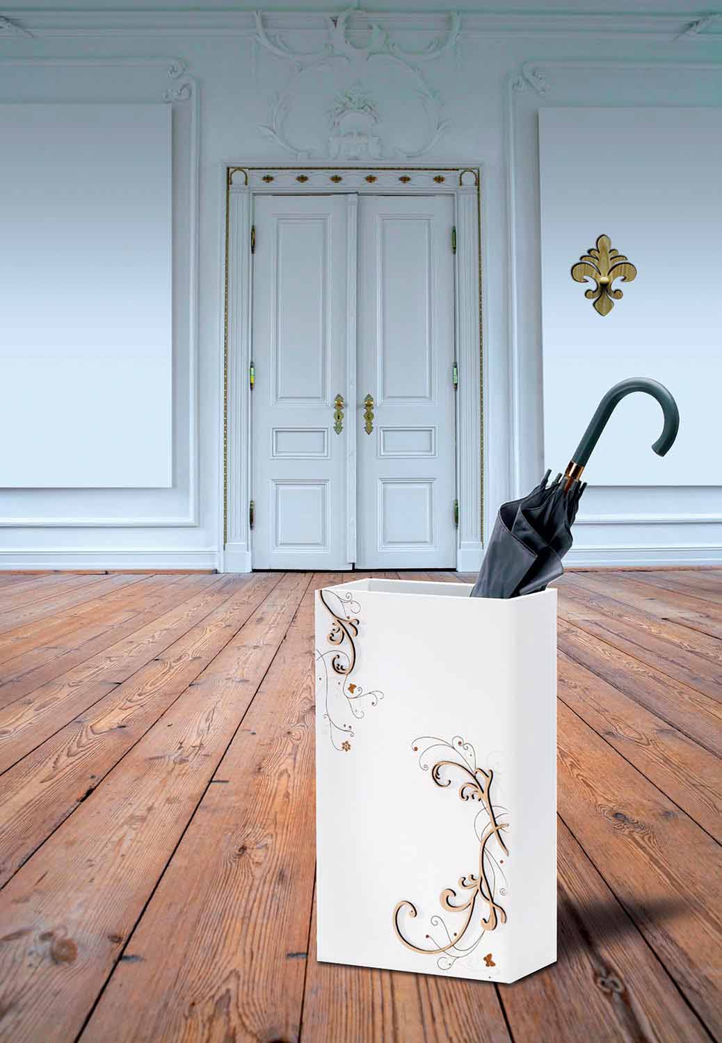 Verleihen Sie Ihrem Wohn- oder Eingangsbereich mit der klassischsten Neuinterpretation des Bodenschirmständers aus lackiertem Holz mit edlen Dekorationsanwendungen einen Hauch von extremer Eleganz und Raffinesse. Im Inneren befindet sich ein praktisches Tablett zum Sammeln von Wasser.