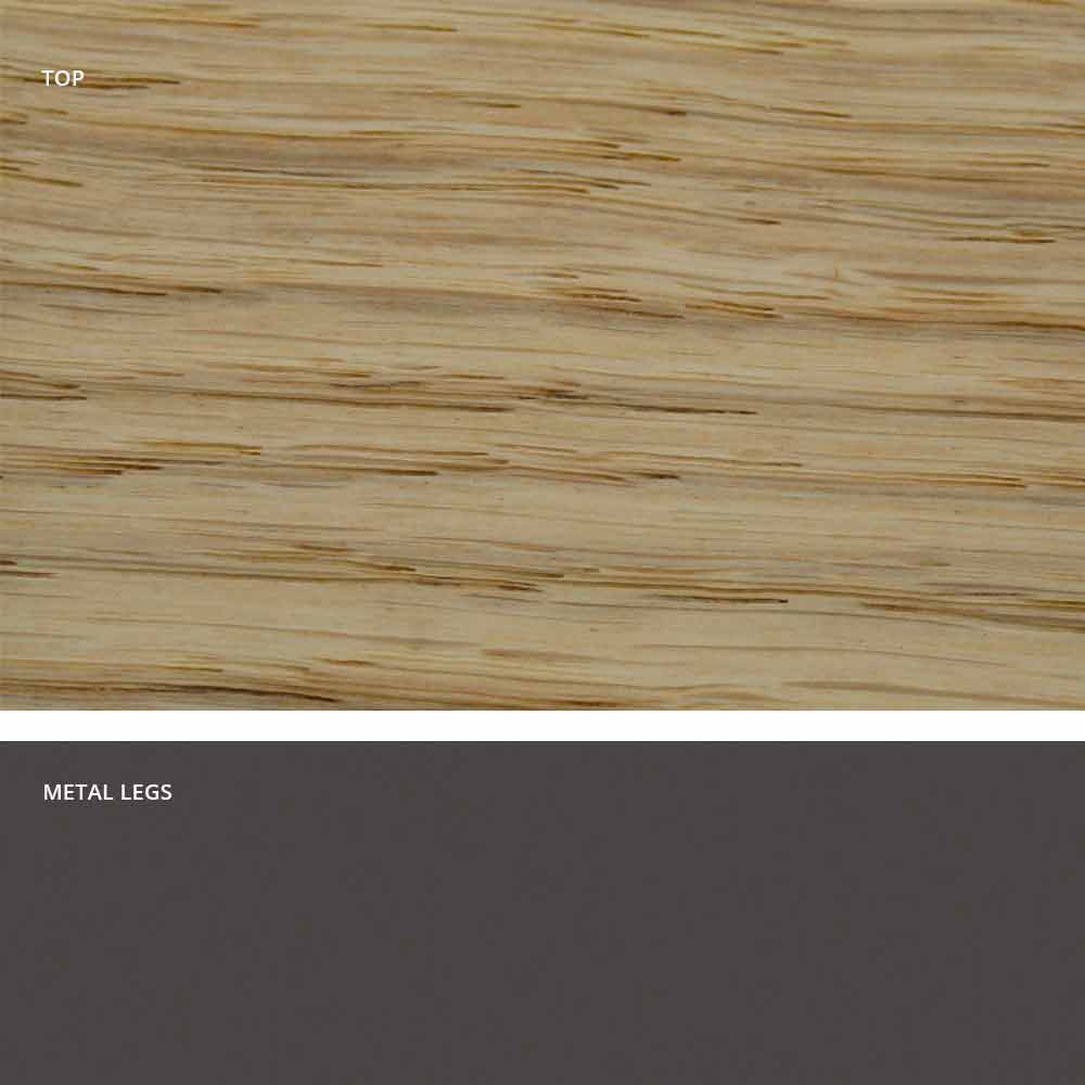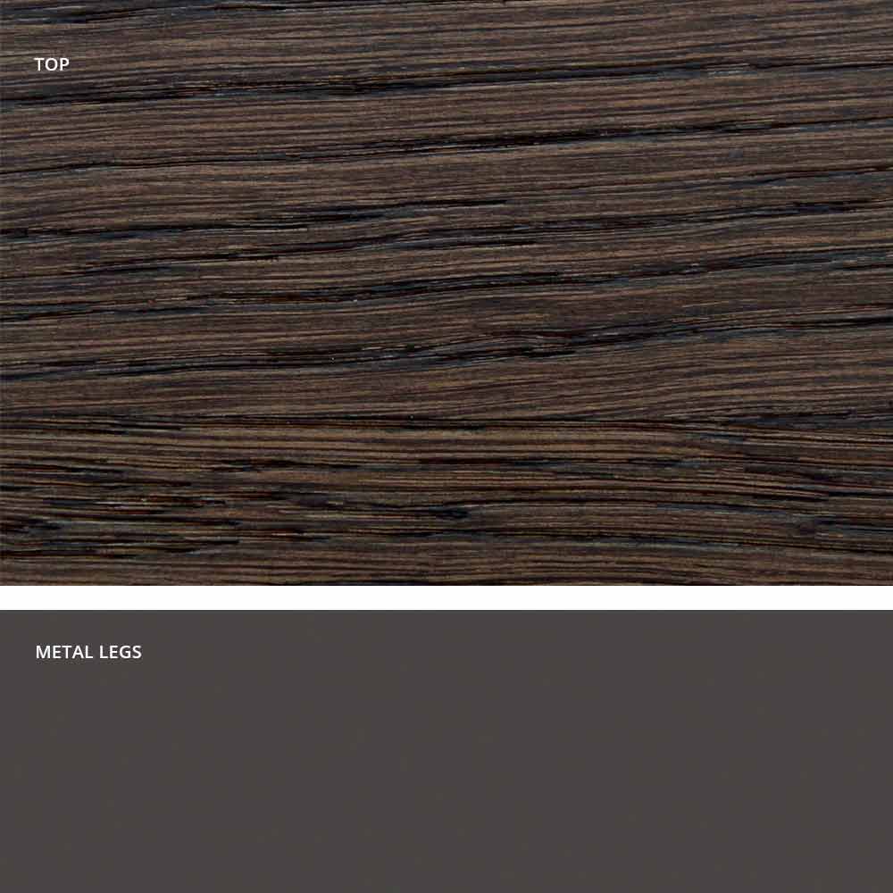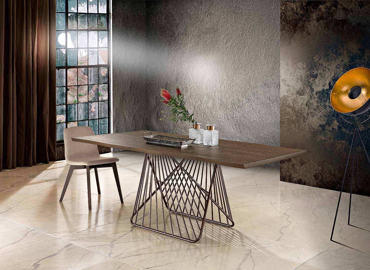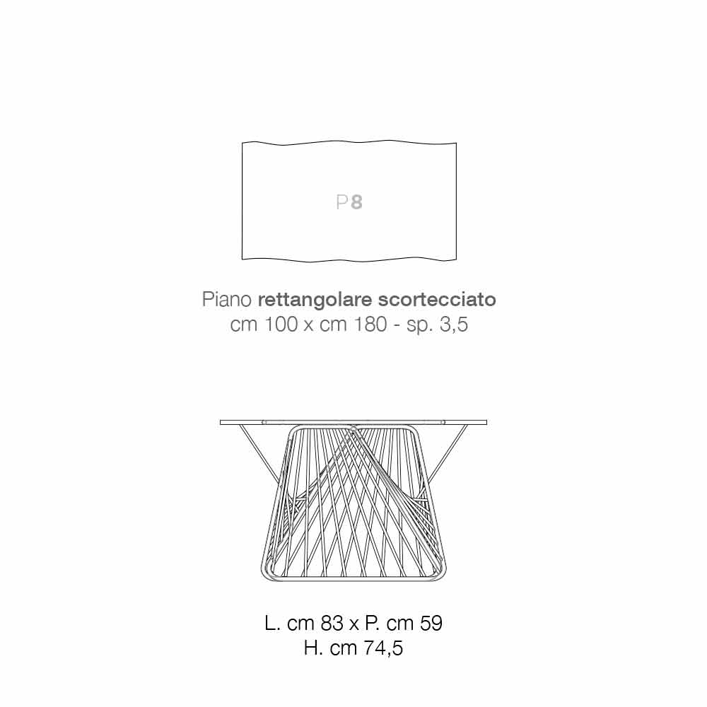 Mitia ist ein in Italien gefertigter fester Tisch mit lackiertem Metallfuß und einer massiven Holzpartikeloberfläche (Dicke 35 mm), die an den Längsseiten furniert ist.