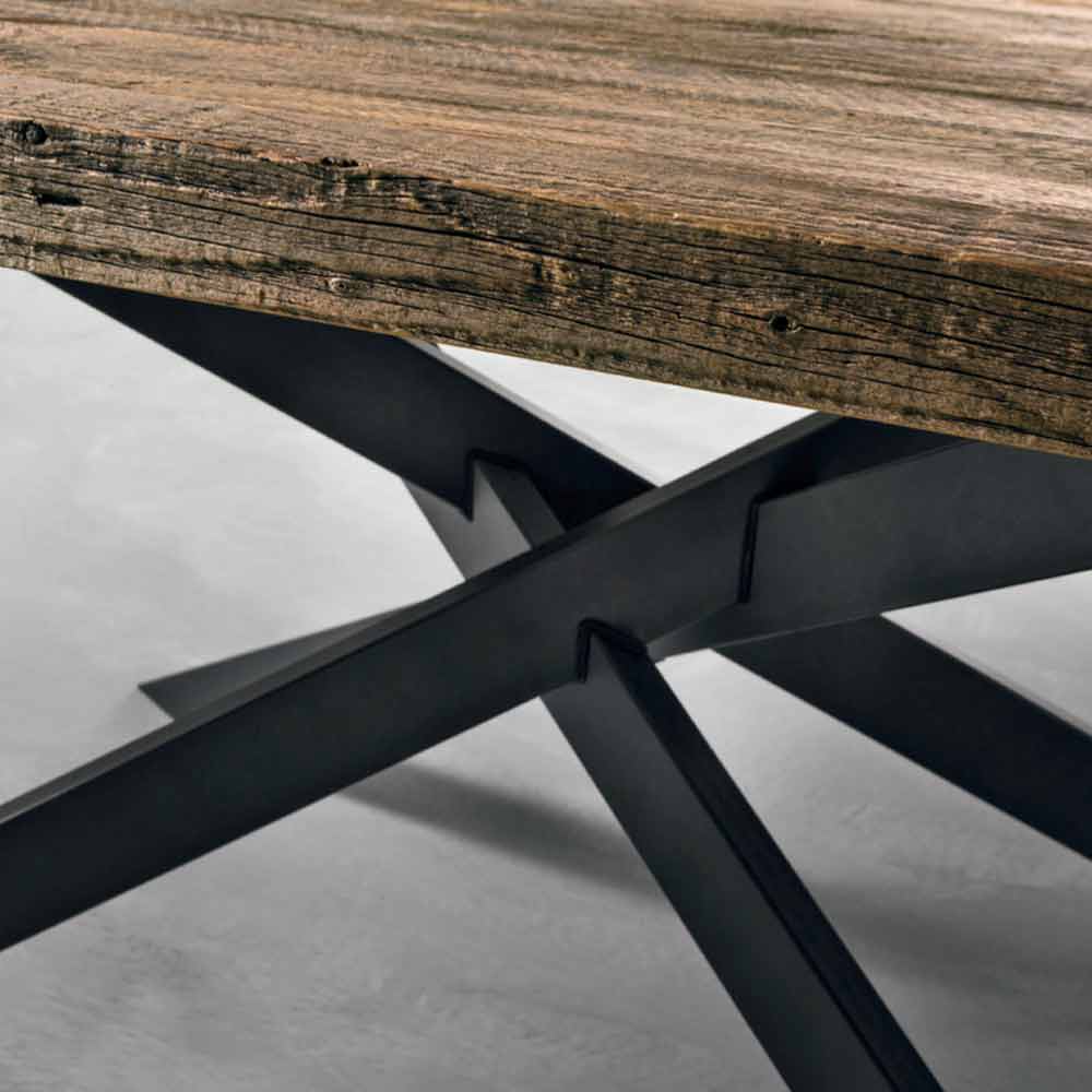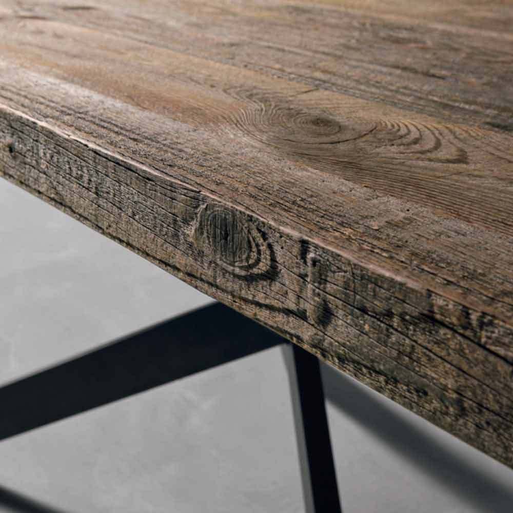 Er wurde in Italien handgefertigt und verfügt über eine Massivholzplatte aus: gealterter Tanne oder Natureiche; Hergestellt im Faltverfahren mit einer Dicke von 60 mm. Die Struktur besteht aus mikrogeprägtem anthrazitfarbenem Metall mit gekreuzten Rohren und Füßen.