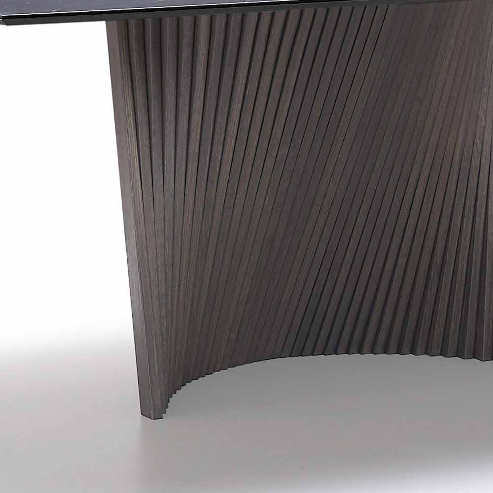 - Tischgestell mit über 70 handgeölten Eschenholzstreifen in grauschwarz und Tischplatte in Halbfassform aus Steingut in Marmor-Effekt Pulpis brown matt;
