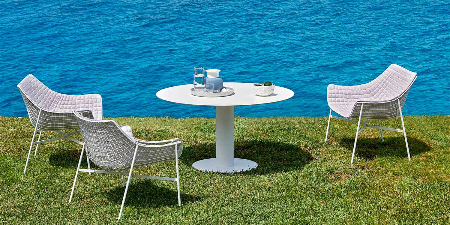 Summer Set ist einer fantasticher Gartensessel mit einer tragender Struktur aus pulverbeschichtetem Stahl in zwei verschiedenen Farben lackiert: weiss oder schwarz.
