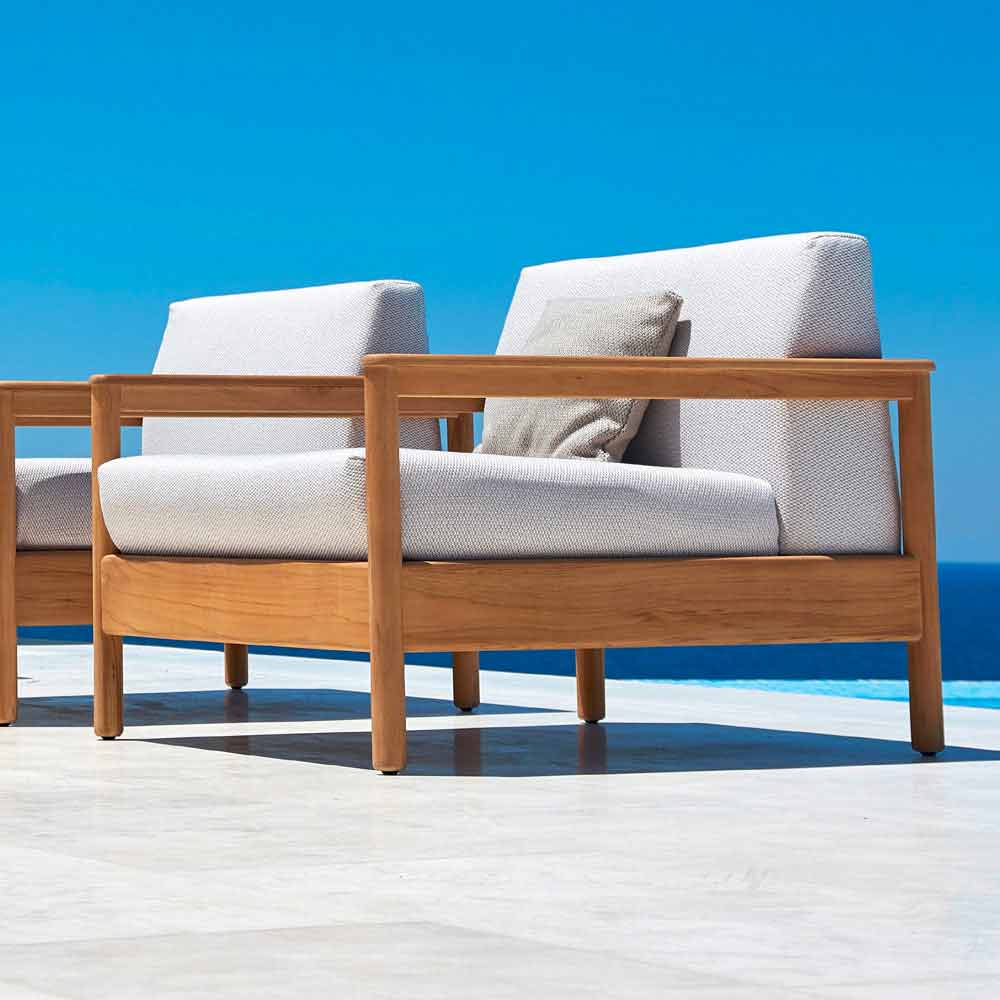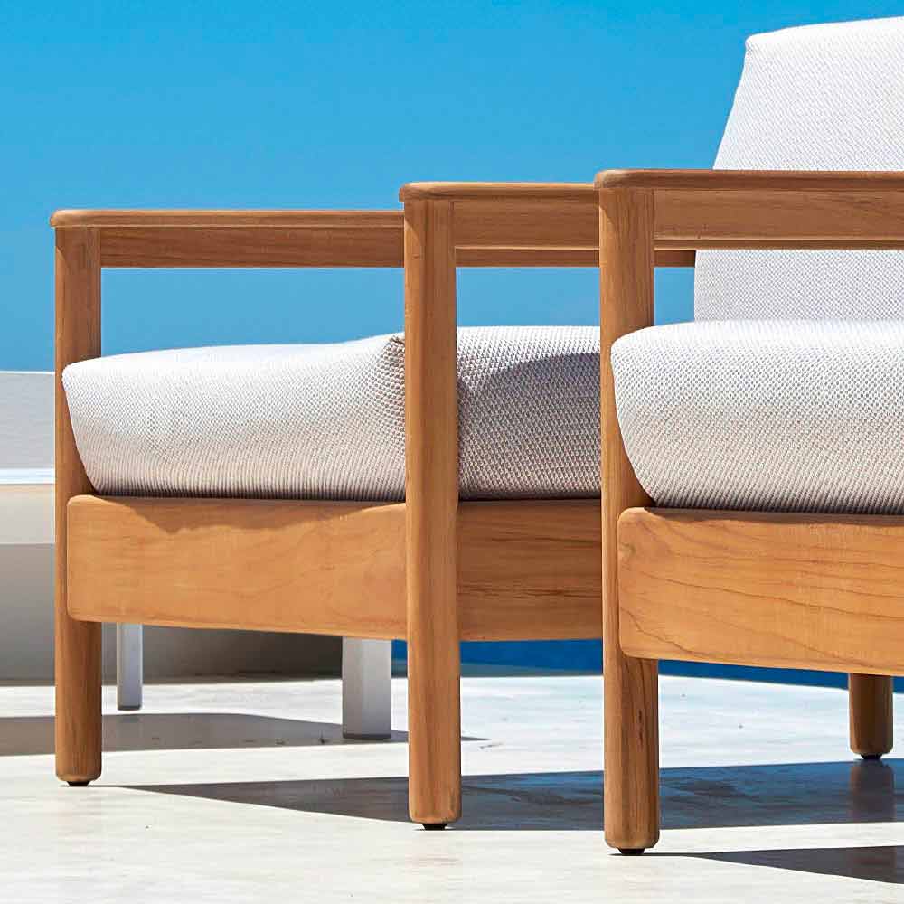 Bali ist ein fantastischer Gartensessel, der sich durch eine tragende Struktur aus massivem Teakholz von zertifizierten Plantagen und Sitzen und Rückenlehnen auszeichnet, die mit Stoff bezogen und mit Dryfeel-Gummi gepolstert sind.
