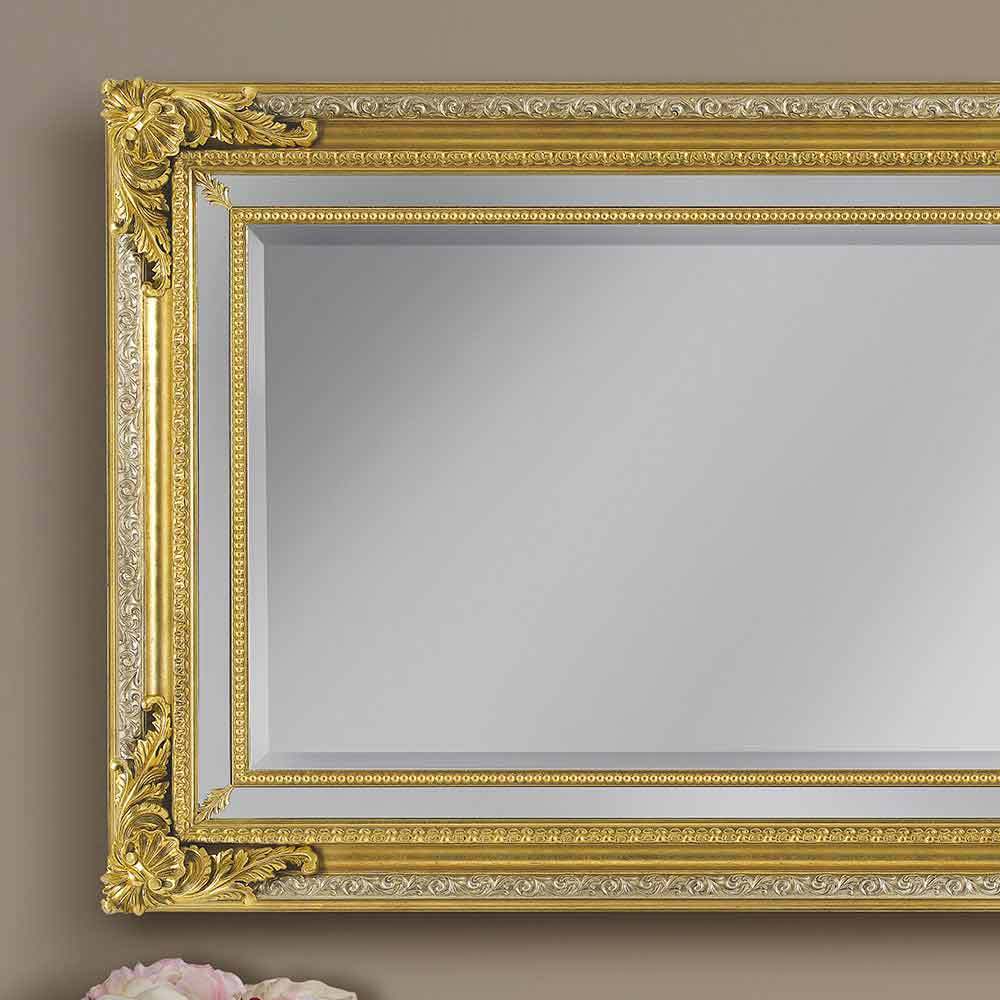 Dieser elegante Spiegel ist ein leuchtendes Beispiel für Schönheit und Handwerkskunst. Der Rahmen ist ein Triumph des klassischen Designs, angereichert mit aufwendigen Details und Friesen, die das Licht und den Charme der Barockzeit einfangen. Jede Ecke ist mit floralen Ornamenten und üppigen Motiven verziert, die zu einem Rahmen purer Pracht verschmelzen.