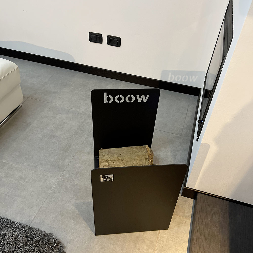 Brennholzhalter für Kamin aus hochwertigem ungiftigem pulverbeschichtetem Stahl. Entworfen, entworfen und handgefertigt in Italien mit dem Ziel, nicht nur die Nützlichkeit des Holzhalters selbst, sondern auch seinen ästhetischen Wert hervorzuheben.