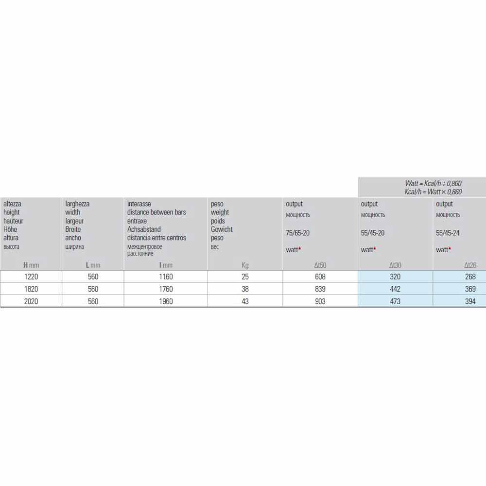 - H 1820 x L 560 x Inter. 1760 mm x Ausgang w (Δt50 *) 839; Ausbeute w (Δt30 *) 442; Ausbeute w (Δt26 *) 369