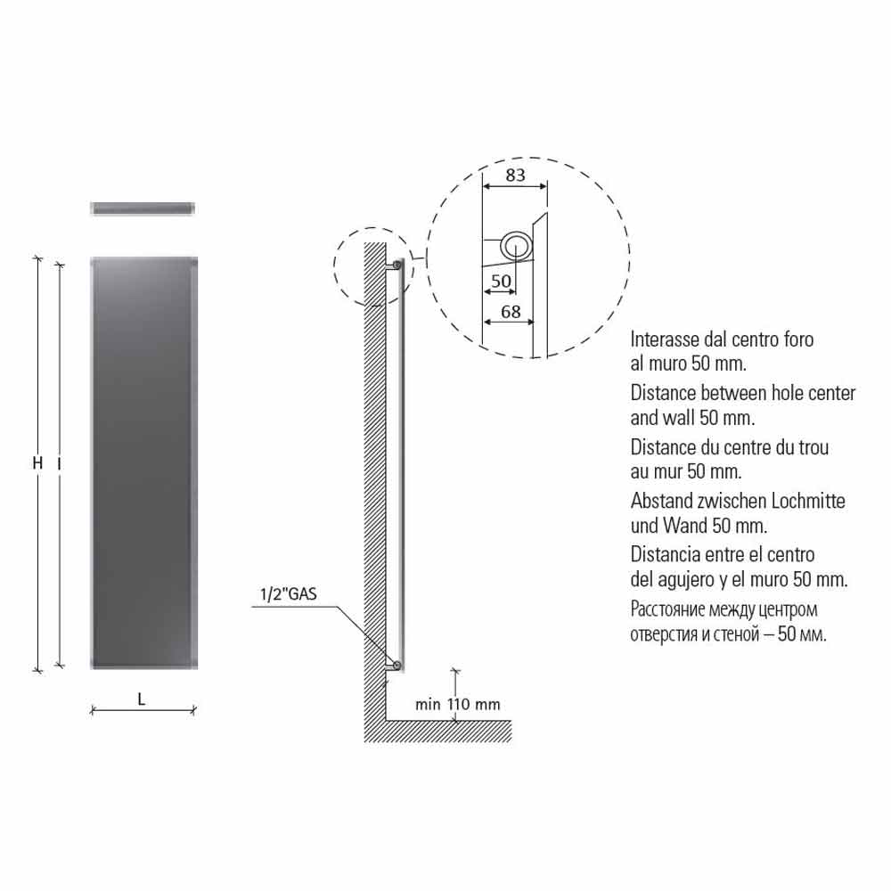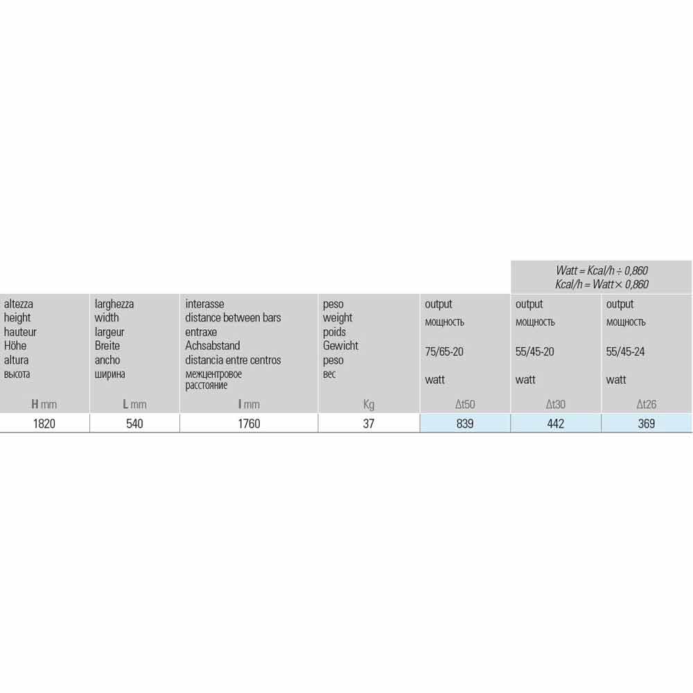Maße H 1820 x L 540 x Inter. 1760 mm x Leistung Δt50 839 w, Δt30 442 w, Δt26 369 w