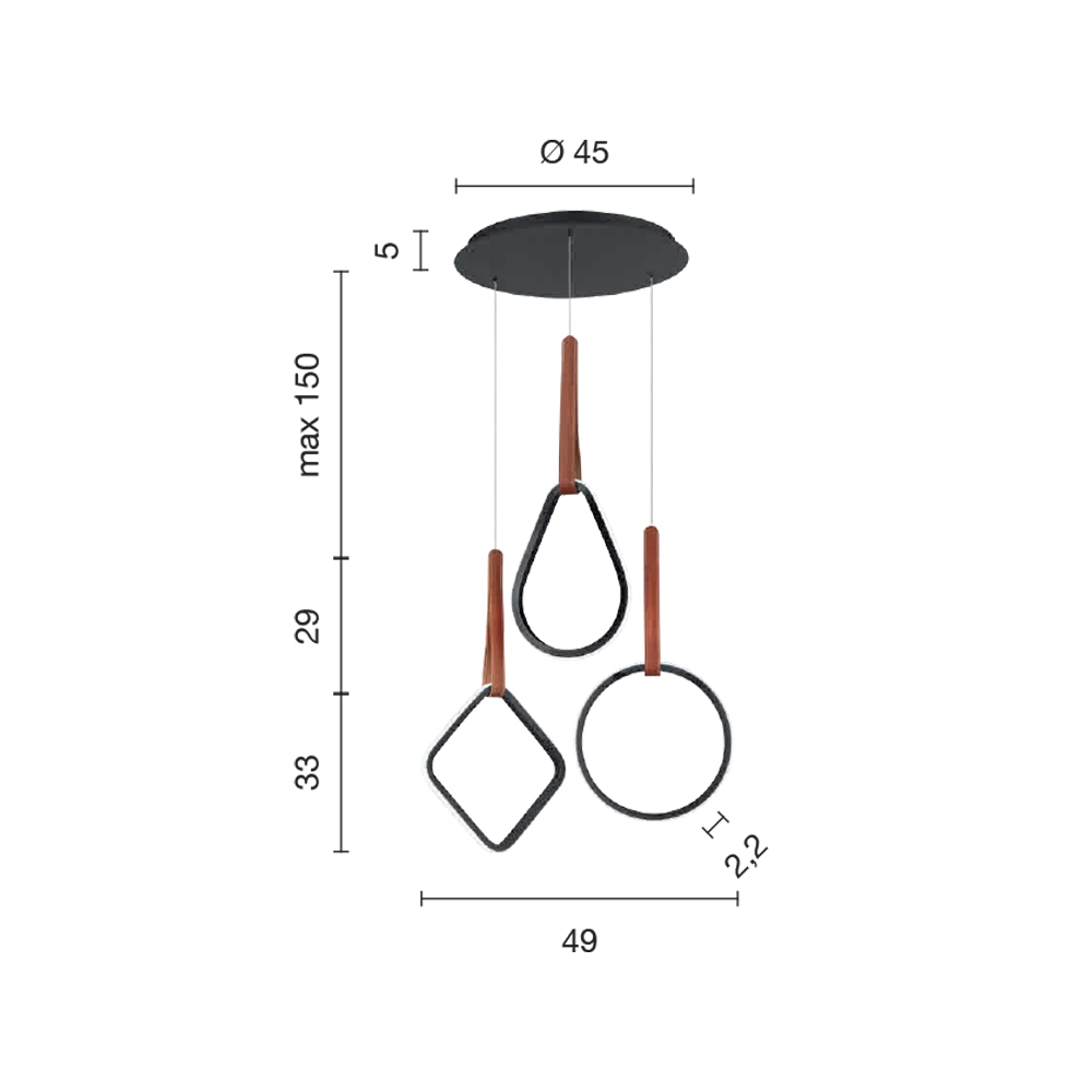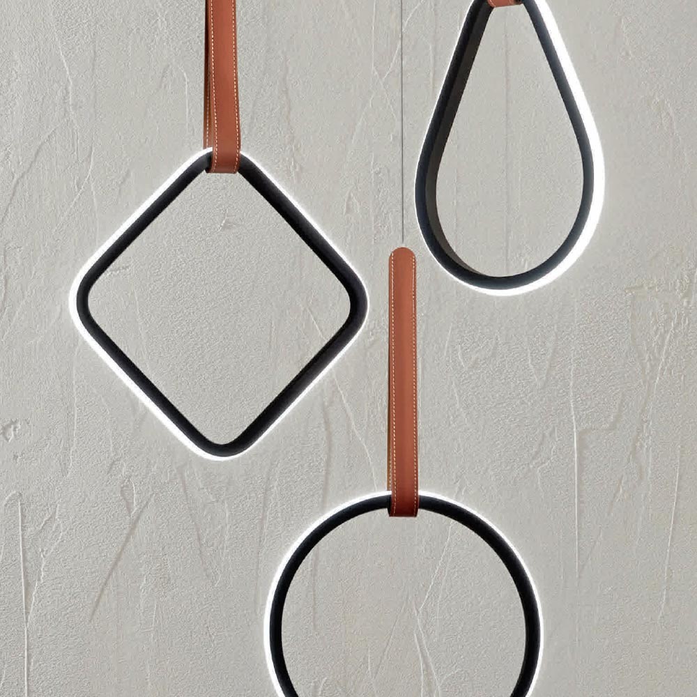 Komplett in Italien hergestellterKronleuchter aus schwarz lackiertem Metall und Element auslederfarbenem Kunstleder mit längenverstellbaren Kabeln und dimmbaren LED-Leuchten in verschiedenen geometrischen Formen. Ziel dieses Produkts ist es, die Tradition durch einen zeitgenössischen Ansatz aufzuwerten, bei dem Stil, Klasse und Innovation zu neuen Designformeln verschmelzen, um jede Umgebung mit Geschmack und Charakter einzurichten und zu beleuchten. Stärken sind die Besonderheit der Formen , die Qualität der Materialien und die Einzigartigkeit der Lichtquelle .