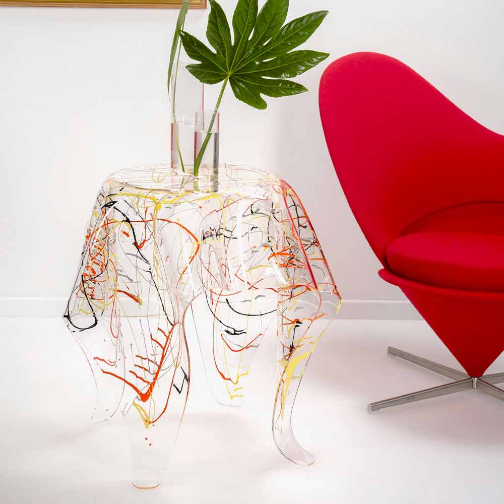 Mehrfarbiger Couchtisch aus Plexiglas, hergestellt in Italien, Otto Der drapierte Otto-Tisch ist ein Einzelstück, ein Kunstwerk moderner Kunst. Eine 100% reine Polymerfolie aus reinem PMMA-Plexiglas mit Farbspritzlackierung, die bei hohen Temperaturen von Hand drapiert wird, um einen einzigartigen und nicht wiederholbaren Tisch zu schaffen.
