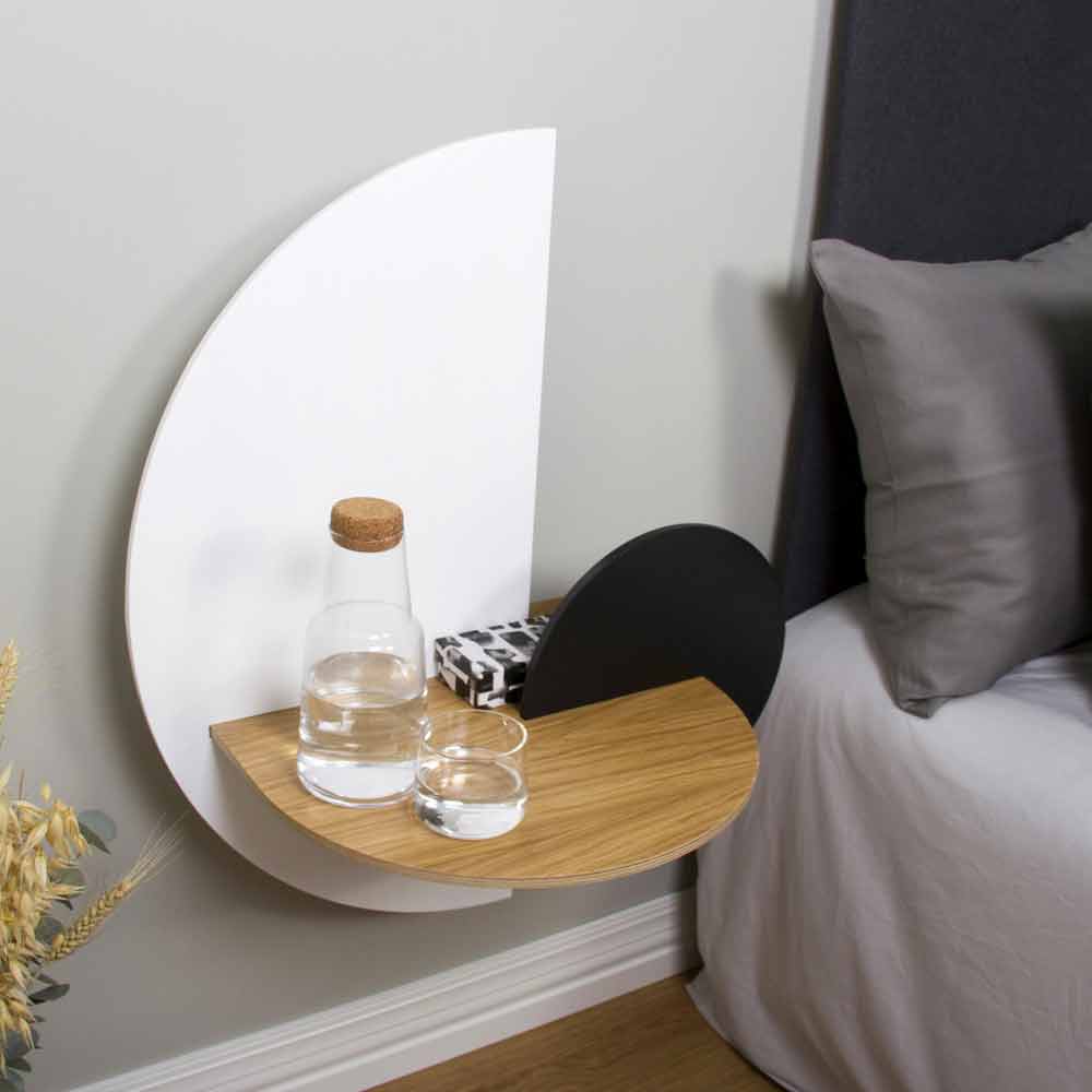 Der Nachttisch ist eines der wichtigsten Elemente in jedem Schlafzimmer und es ist notwendig, dass die Struktur Funktionalität und dekorativen Aspekt kombiniert. Was diesen Nachttisch auszeichnet, ist sein innovatives und originellesDesign , das die Einrichtung jedes Schlafzimmers revolutionieren kann, das einen Hauch von Persönlichkeit und Eleganz benötigt . Seine Struktur hat einfache geometrische Linien , die dem Produkt Einzigartigkeit und Harmonie zwischen den Formen verleihen. Die Struktur wird durch die Verwendung von 3 Sperrholzplatten hergestellt, von denen eine in Eichenoptik an der Wand befestigt ist, die als echte Auflagefläche fungiert, und zwei in schwarz-weiß gebeizter Esche, die darauf montiert sind und bis zu 8 verschiedene zulassen Konfigurationen , mit denen Sie ein Produkt erhalten, das an Ihre Bedürfnisse angepasst werden kann. Zwischen den 2 modularen Paneelen und der Rückwand befinden sich außerdem 2 versteckte Fächer von jeweils 9 cm, ideal zum Aufbewahren und Organisieren von Büchern und Zeitschriften oder anderen Gegenständen, die Sie immer zur Hand haben möchten. Um die Funktionalität des Artikels weiter zu verbessern, verfügt die Struktur über eine praktische Kabelführung hinter der Frontplatte, mit der Sie Kabel und Ladegeräte verstecken können. Dieses Designobjekt stellt eine innovative und originelle Idee dar, die dank ihres einzigartigen Stils und der Kombination von Materialien und Oberflächen, die Eleganz und ein äußerst modernes Design verleihen, jede Aufmerksamkeit im Raum auf sich ziehen kann. Schnell und einfach mit einem einfachen feuchten Tuch zu reinigen.