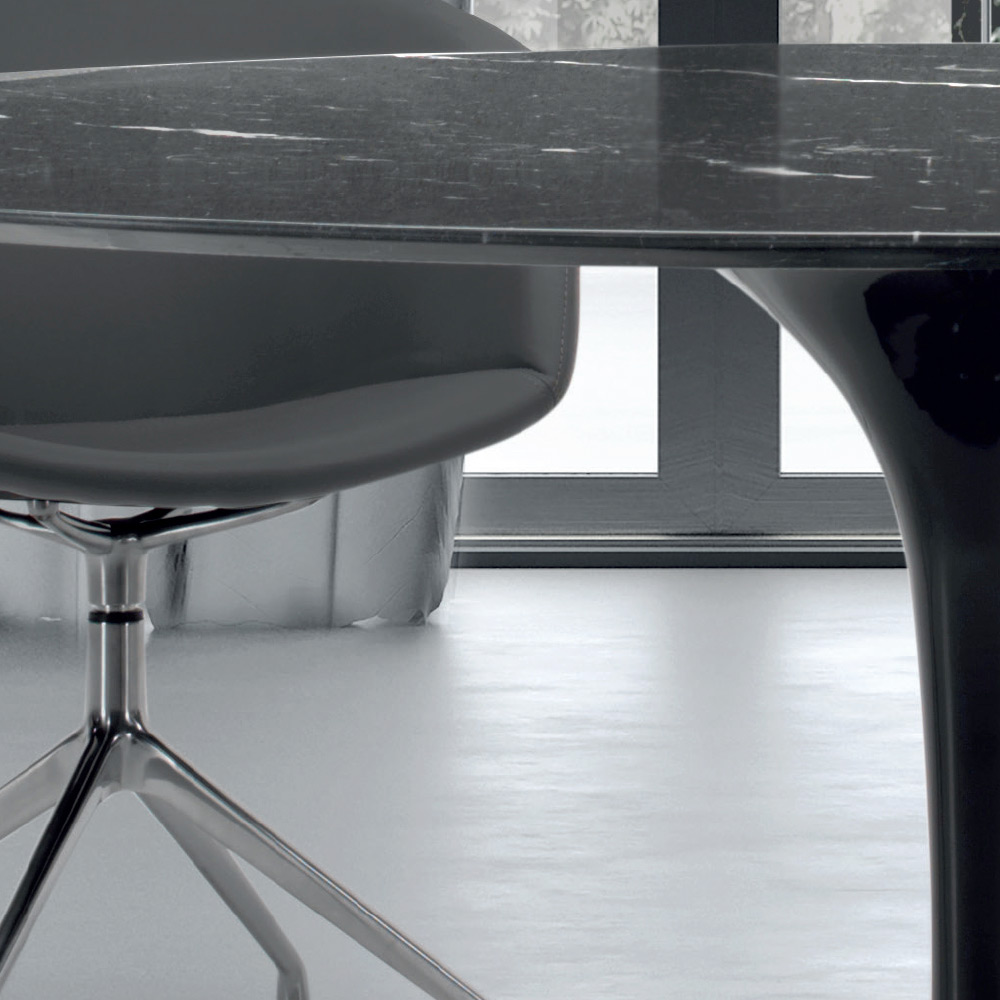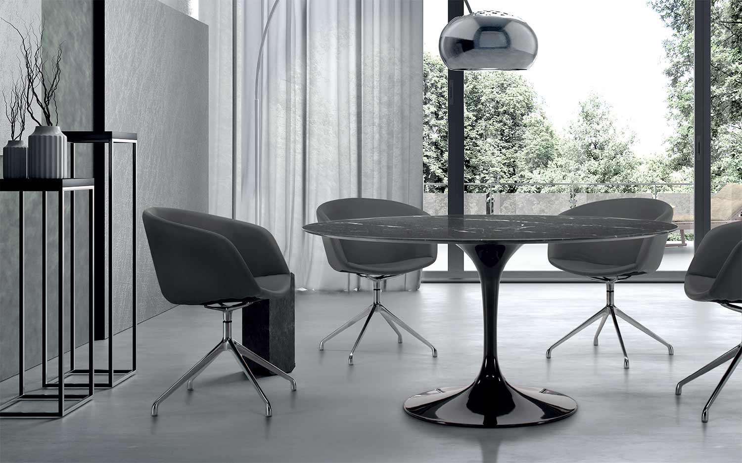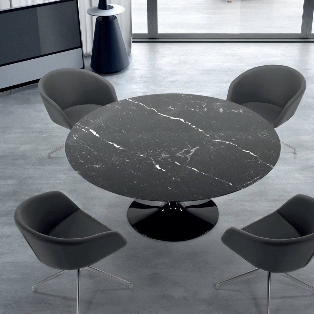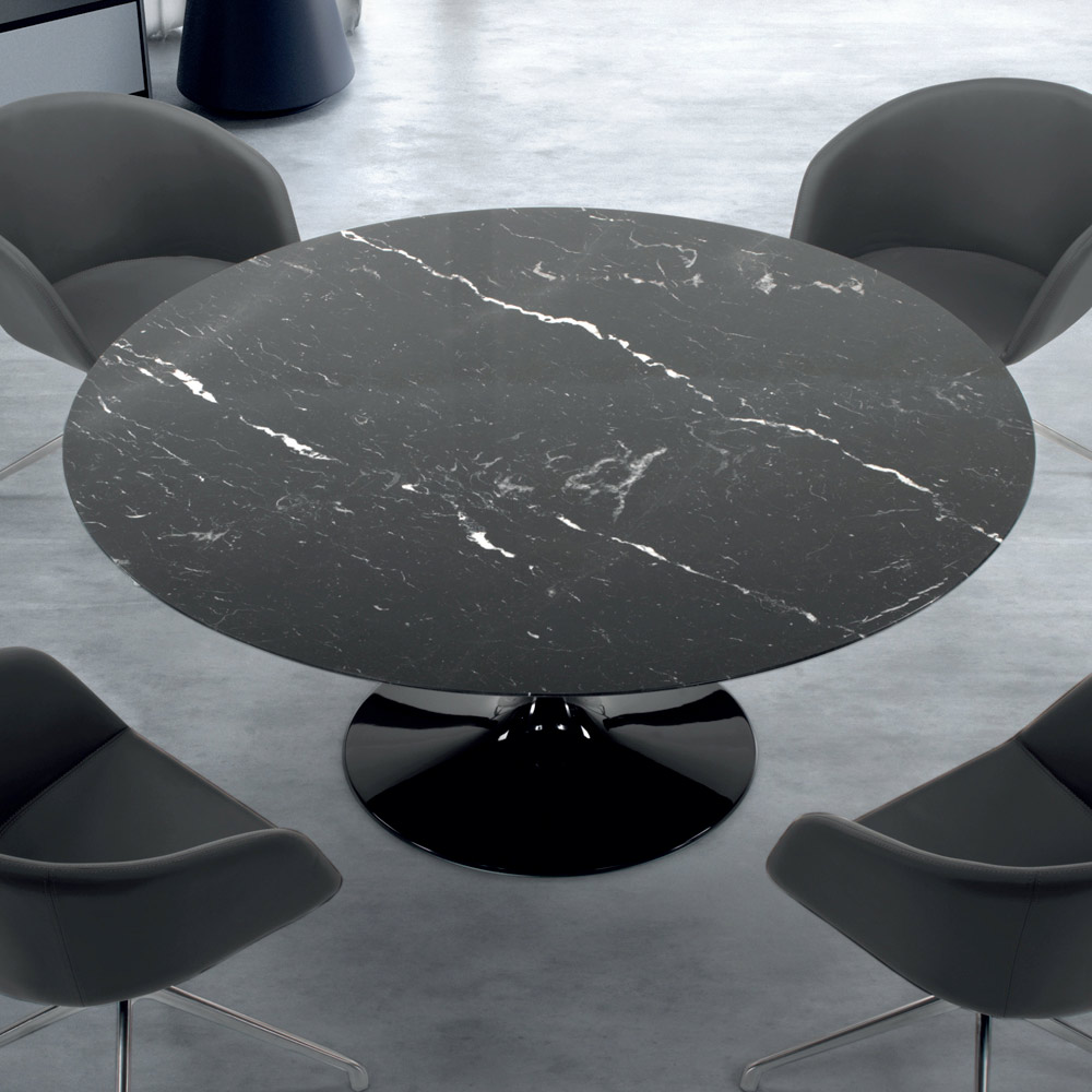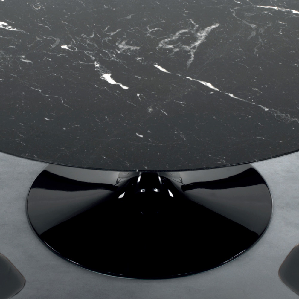 Moderner runder Tisch mit Tischplatte aus Nero-Marquinia-Marmor, handgefertigt in Italien.