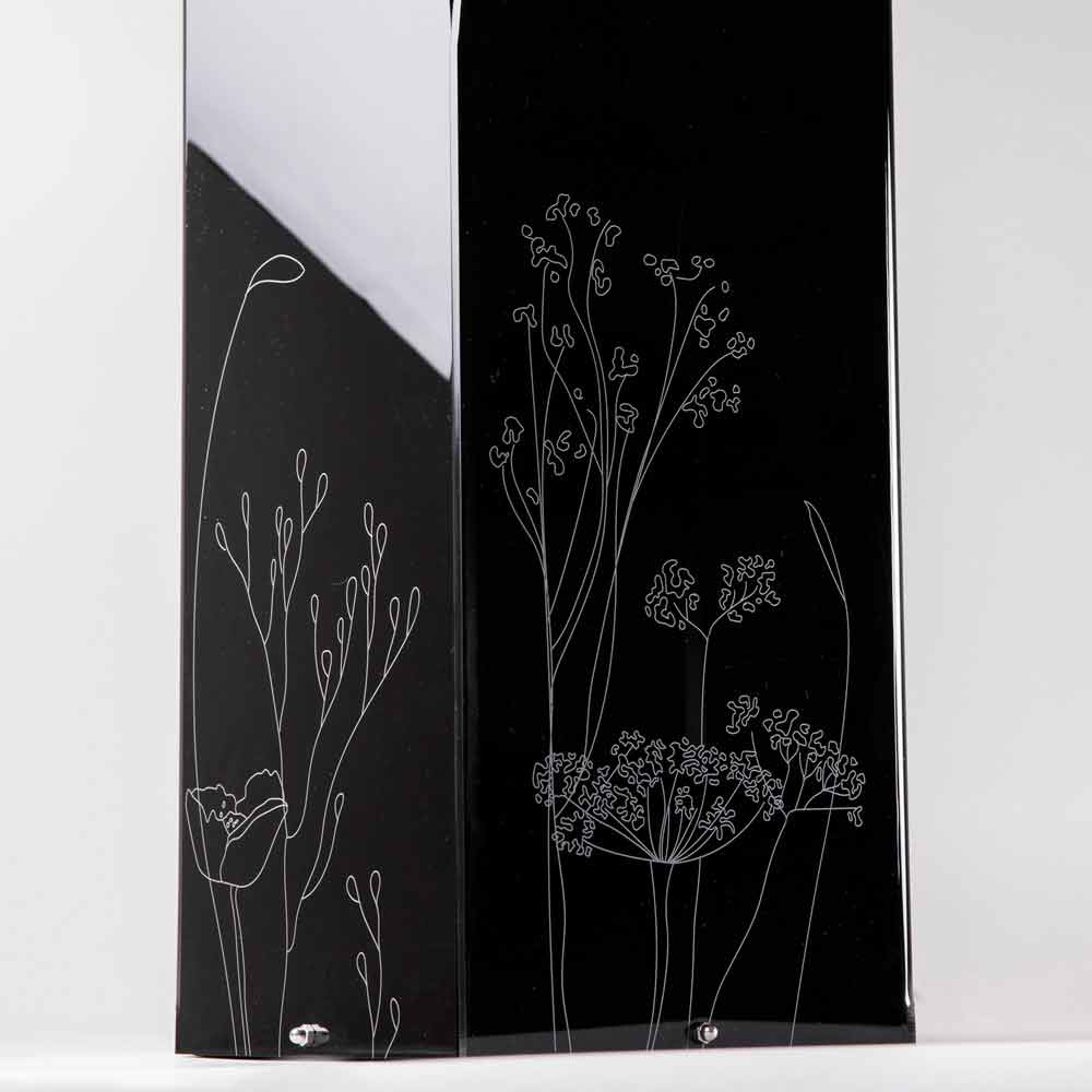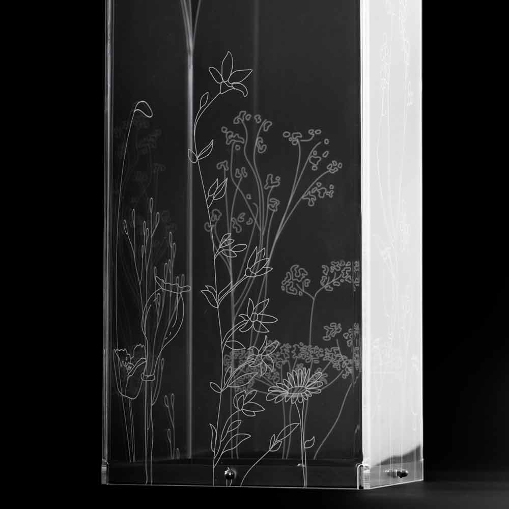 Der Schirmständer aus Plexiglas besteht aus zwei Ausführungen und zeichnet sich durch die laserbeschrifteten Blumendekorationen im stilisierten Stil mit Edelstahlsockel aus.