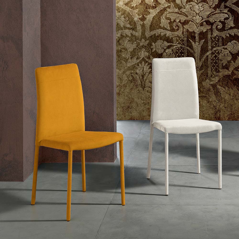 Porzia ist ein schlichter Stuhl für das Wohnzimmer , der in Italien hergestellt wurde und komplett mit Stoff bezogen ist. Er ist in verschiedenen Farben erhältlich: