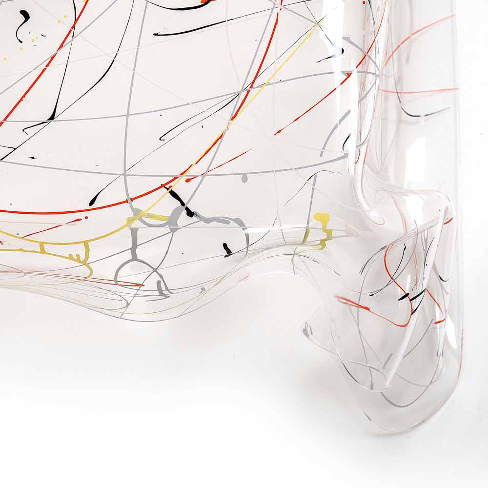 Design Plexiglas Couchtisch hergestellt in Italien, Asien Jeder Asien-Drapiertisch ist ein Einzelstück, ein Kunstwerk moderner Kunst. Eine Platte aus reinem, neuem Polymer, 100% PMMA-Plexiglas mit Spritzlackierarbeiten; Bei hohen Temperaturen wird er von Hand drapiert, um einen einzigartigen und nicht wiederholbaren Tisch zu schaffen. Die gebaute Struktur ist völlig selbsttragend.