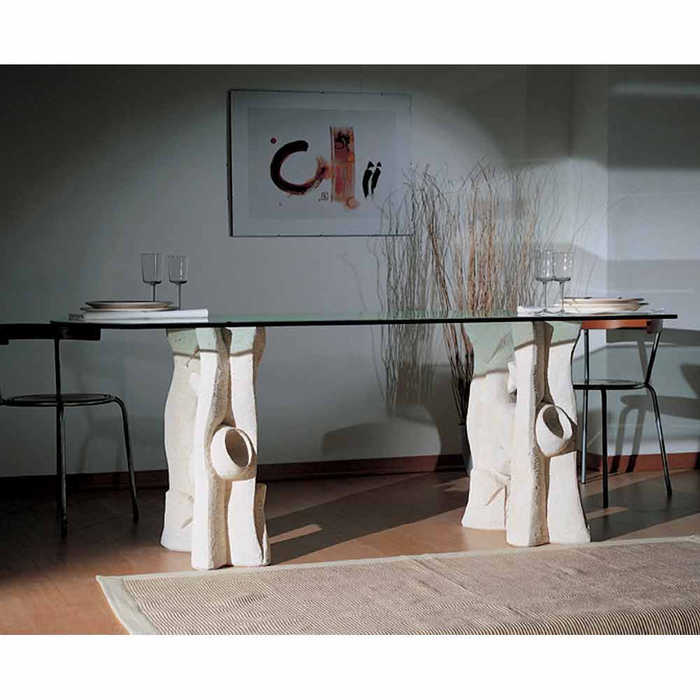 Die Basis ist aus Naturstein aus Vicenza hergestellt und wird von Hand bearbeitet. Die Tischplatte besteht aus Kristall float mit einer Dicke von 15 mm und ist an dem Stein mit einem Flansch befestigt.