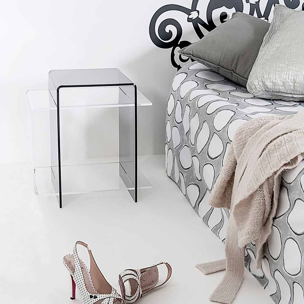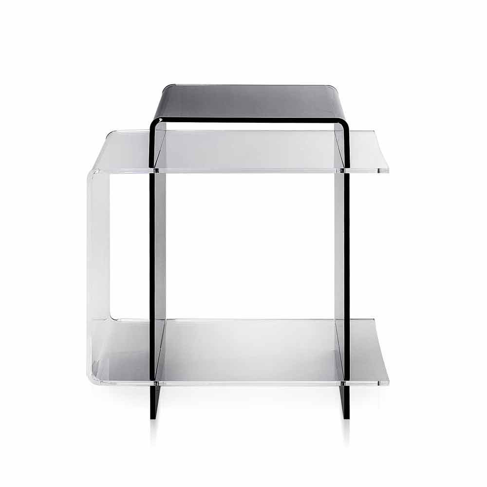 Moderner Tisch mit 3 geräucherten und transparenten Regalen Gosto made in Italy Vielseitiger geräucherter und transparenter 3-Regal-Couchtisch / Nachttisch, inspiriert von den Geometrien und Bi-Farben der 70er Jahre, aus 100% reinem Polymer-Plexiglas, lasergeschnitten und bei hohen Temperaturen gebogen. Die wichtige Dicke macht die Struktur völlig selbsttragend. Plexiglas ist stoßfest, nicht verformbar, unveränderbar und wärmeisolierend. Die Helligkeit und Helligkeit werden über die Zeit konstant und unverändert beibehalten. Das PMMA Plexiglas aus reinem Polymer ist ungiftig, hypoallergen, geruchlos und antibakteriell. 100% recycelbar. Entworfen, entworfen und hergestellt in Italien, mit italienischen Materialien.