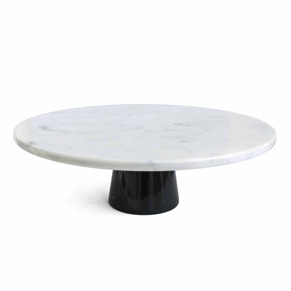 Eleganter moderner Tortenständer mit weißer Carrara- Marmorplatte und schwarzem Marquinia- Marmorsockel. Hergestellt aus hochwertigem feinem Marmor. Es ist ein Unikat, da sich jeder verwendete Marmorblock von den anderen für Adern und Schattierungen unterscheidet.