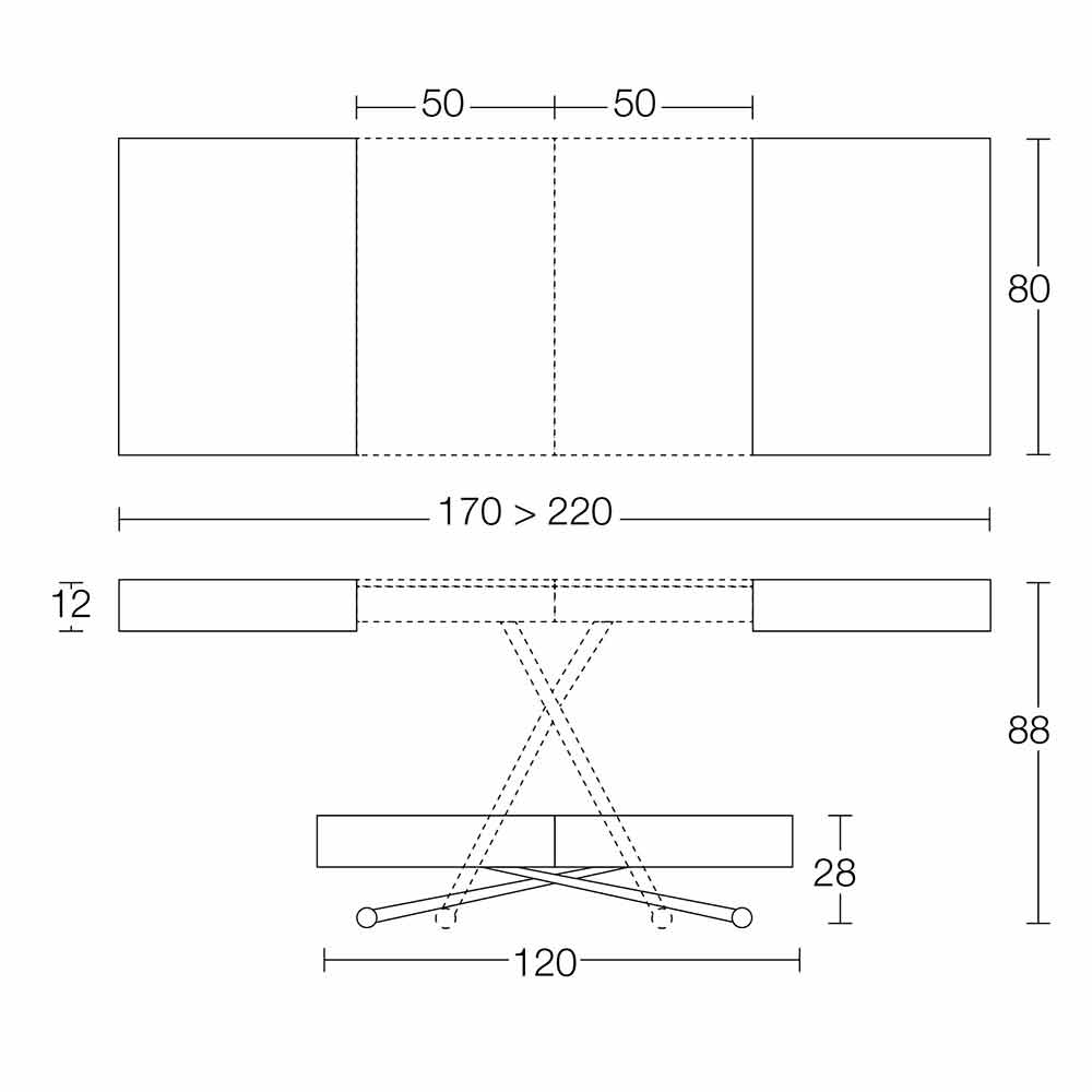 Maße Couchtisch: L 120 x T 80 x H 28 cm Tisch: L 170 (220) x T 80 x H 88 cm