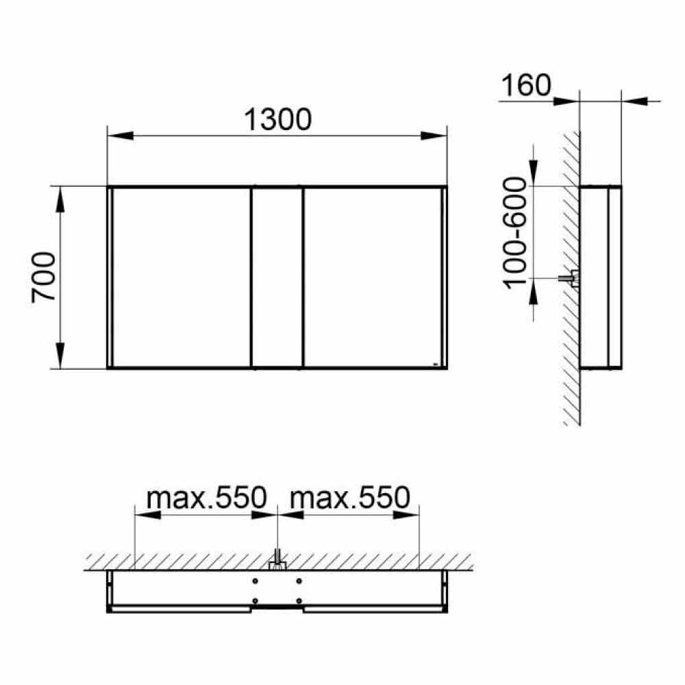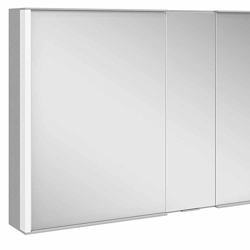Spiegelschrank für Wandmontage mit Struktur aus eloxiertem, silber lackiertem Aluminium und innerem Rückenteil aus weiß lackiertem Glas . Ausgestattet mit einem festen zentralen Tür- und 2 Spiegel Seitenaustüren (auch intern).