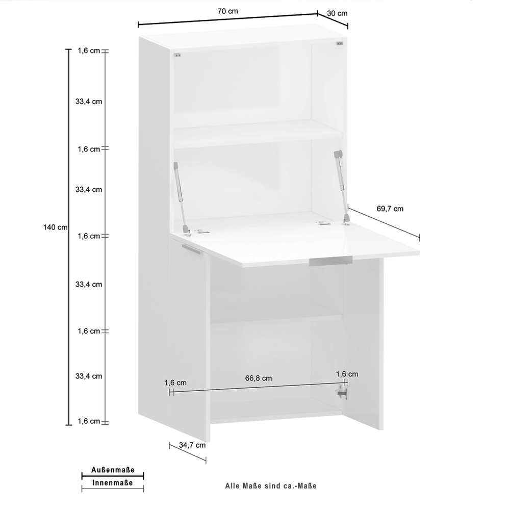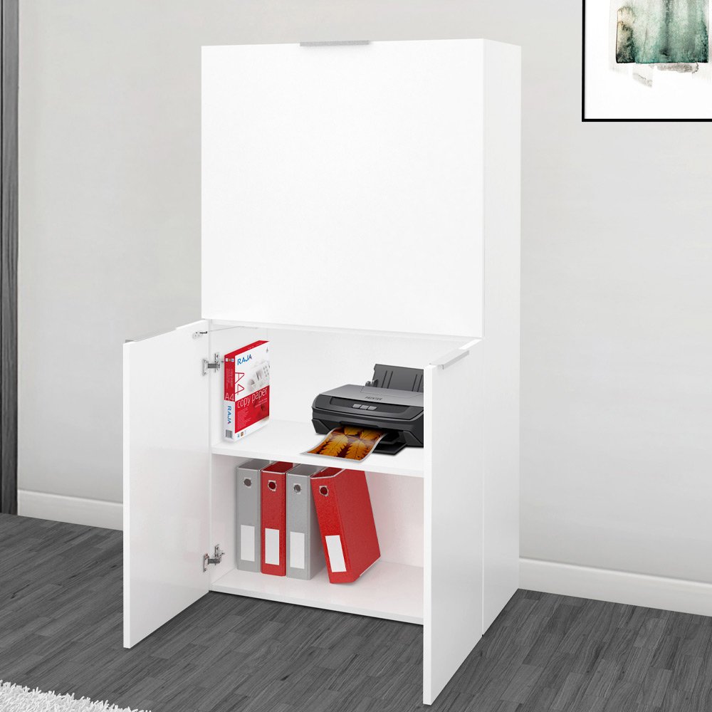 Der wandhängende Schreibtisch zeichnet sich durch sein minimalistisches und platzsparendes Design aus, das im Büro oder im Schlafzimmer platziert werden kann. Der Aufbau besteht aus zwei unteren Flügeltüren und einer oberen Klapptür, die durch den praktischen Griff nach unten geöffnet auch als Tischplatte fungiert.