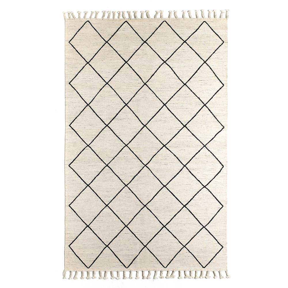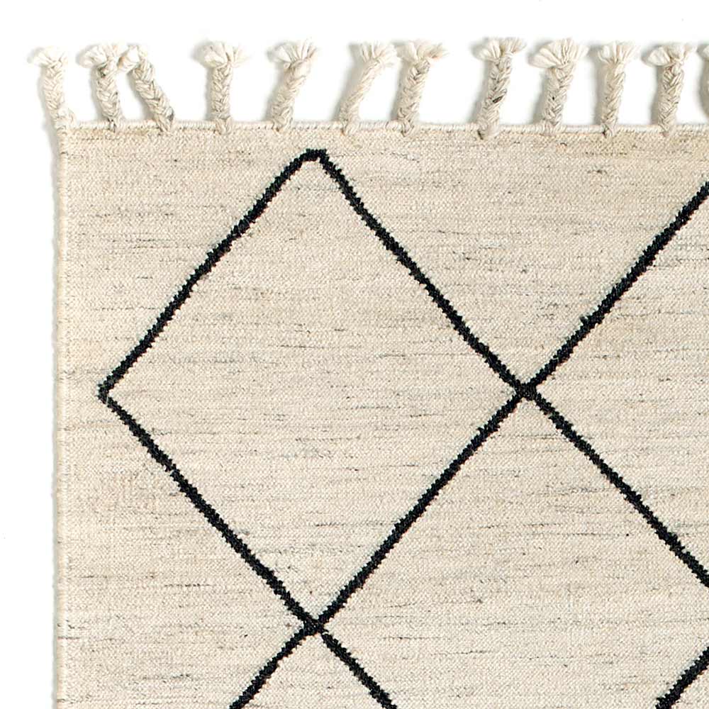 Dieser Teppich besteht aus Wolle und Baumwolle und wird " Kelim " oder ein haarloser Teppich genannt, der nicht geknotet, sondern von erfahrenen Webern handgewebt wird. Im Vergleich zu einem klassischen Teppich ist er leichter und weniger vollmundig und eignet sich perfekt als Dekorationsgegenstand, um das Dekor eines jeden Raums zu bereichern. Was das Produkt besonders auszeichnet, ist das geometrische Muster in Schwarztönen, das zusammen mit den Rändern, die die beiden kürzeren Seiten des Teppichs bedecken, Modernität verleiht. Die verwendeten Materialien und Techniken ermöglichen es, ein qualitativ hochwertiges Endprodukt zu erhalten, das die Aufmerksamkeit auf sich ziehen kann und jede Umgebung einzigartig macht.