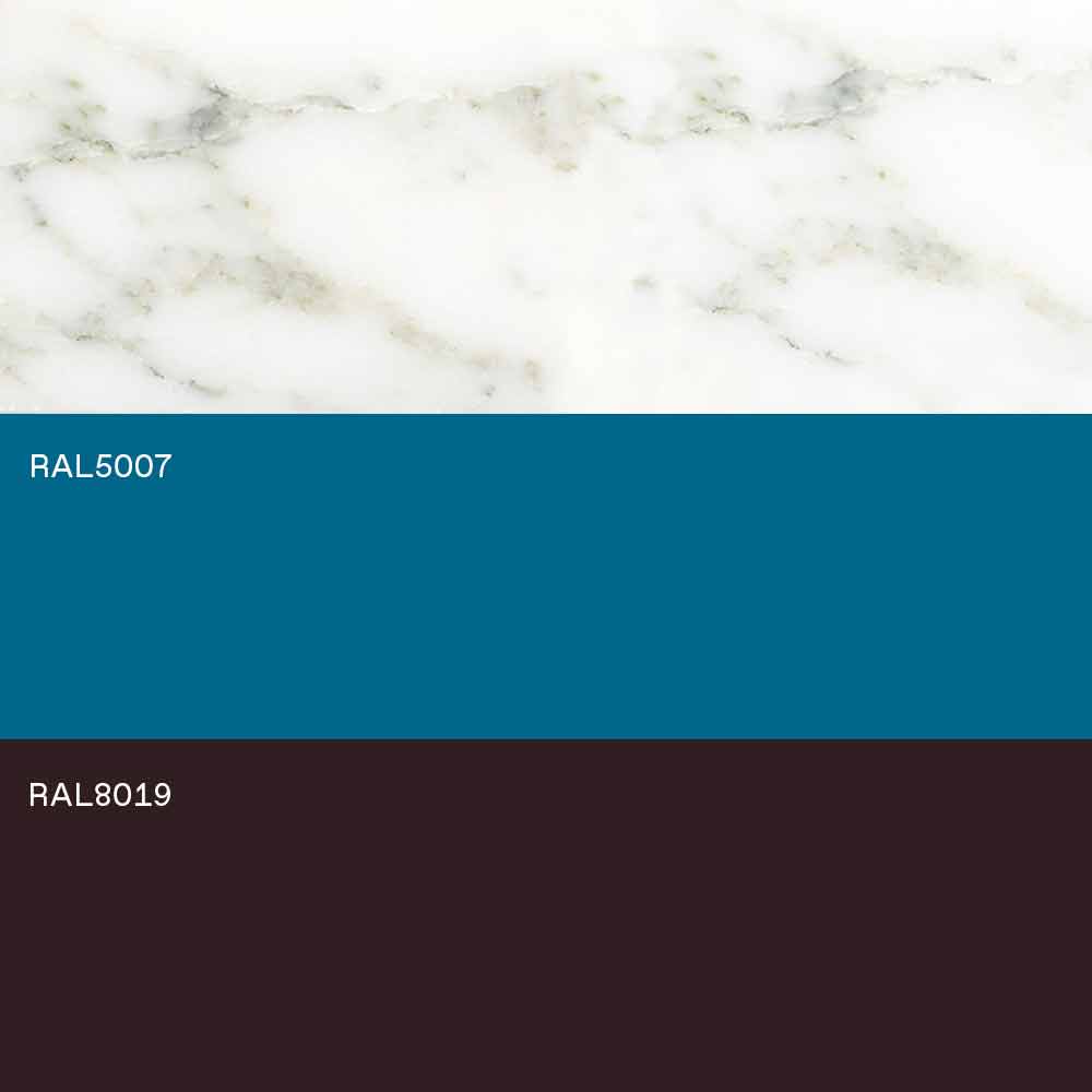 Die Besonderheit dieses Wohnzimmertisches liegt in seiner Struktur, die einem Andreaskreuz nachempfunden ist. Das originelle und funktionelle Gabeldesign der Stahlenden ermöglicht das Einsetzen der Beine, auch aus Stahl, mit einem einfachen Montagesystem. Ein technisches und praktisches Detail, das auch ästhetisch wird: Die Verbindungsschrauben und die Wahl passender oder kontrastierender Farben heben es hervor und schaffen einen industriellen und zeitgenössischen Stil . Die Struktur besteht aus lackiertem Stahl. Ausführung : Kaffee RAL8019 + Kreuz in Hellblau RAL5007 + Platte aus weißem Michelangelo-Marmor