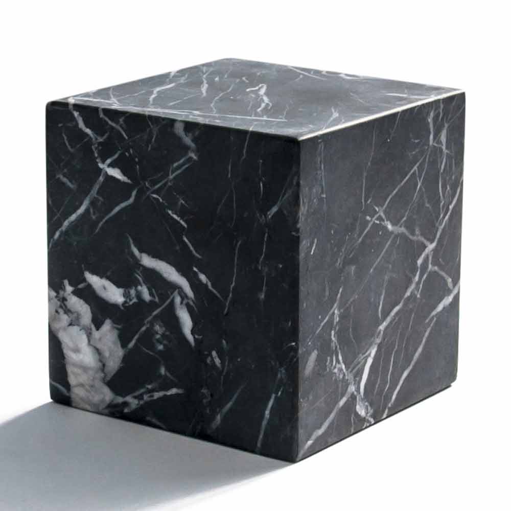 Kleiner Würfel Briefbeschwerer aus schwarzem Marquinia Marmor . Es ist ein Unikat, da sich jeder verwendete Marmorblock von den anderen für Adern und Schattierungen unterscheidet.