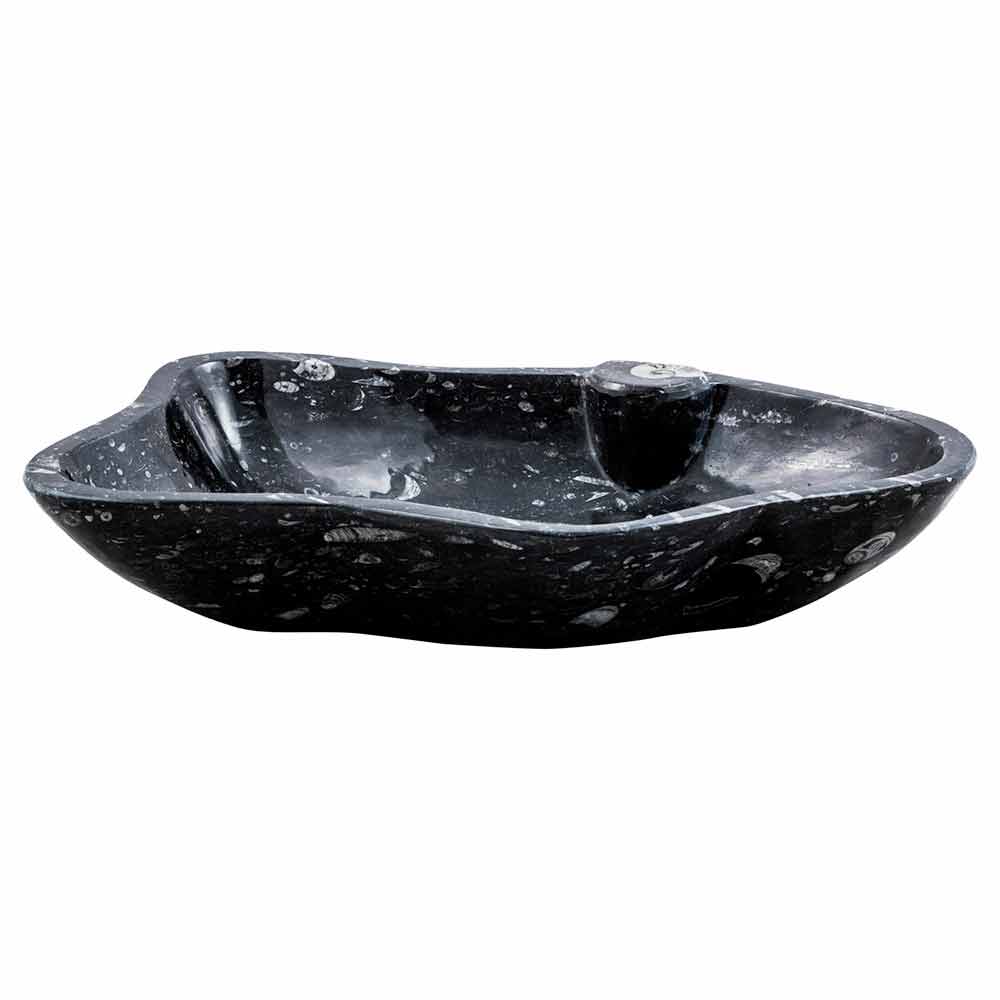 Handgearbeitetes Aufsatzwaschbecken aus Marmor mit Fossilien.