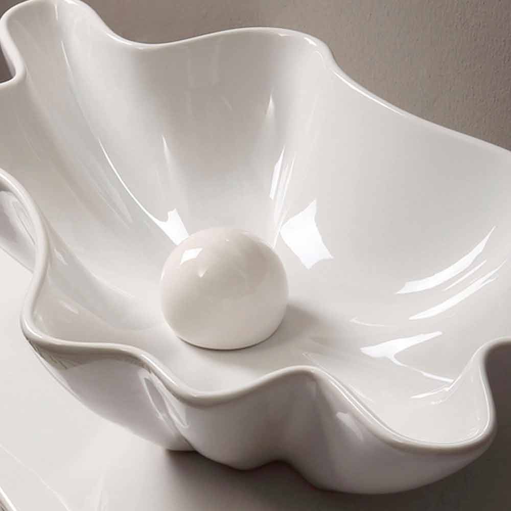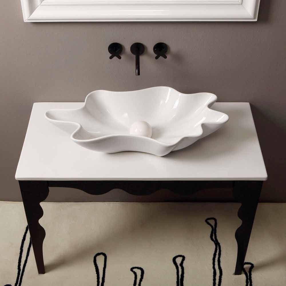 Waschbecken, das durch seinen perlenförmigen Abfluss an das Meer erinnert und so die Illusion erweckt, es sei eine Auster. Mit wichtigen Abmessungen, auch in der Höhe; entfaltet einen entscheidenden Effekt, ein wahrer Protagonist des Badezimmers.