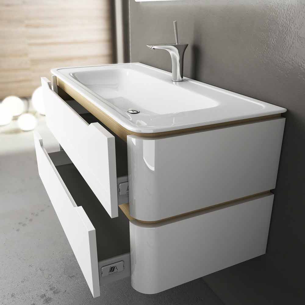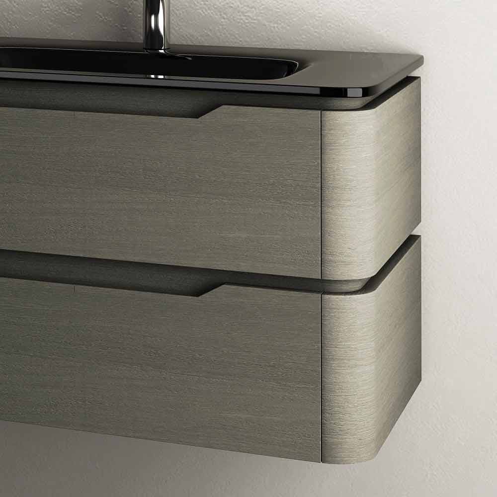 Arya ist ein Badezimmerschrank mit integriertem Waschbecken und 2 ausziehbaren Schubladen mit abgerundeten Seiten. Lackiertes Holz-Finish mit Einsätzen aus Naturholz. Extraklare Glasplatte mit integriertem Becken. Erhältlich in verschiedenen Ausführungen. Arya ist ein Projekt, das durch Geometrien von horizontalen Linien und abgerundeten Seiten konzipiert wurde, um auch aus ästhetischer Sicht exklusive Monoblöcke zu schaffen. Ein Konzept, das sich in allen Produkten dieser Linie manifestiert. Eine bewusst grafische Ästhetik, die durch die Form des Griffs und die Kombination der doppelten Oberfläche für die Fassade noch verstärkt wird.