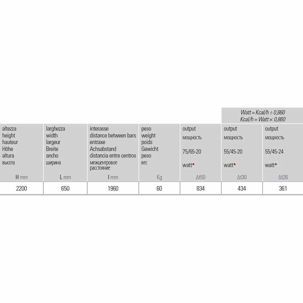 Größe: H 2200 x L 650 x Inter. 1960 mm x Leistung Δt50 834 W, Δt30 434 W, Δt26 631 W.