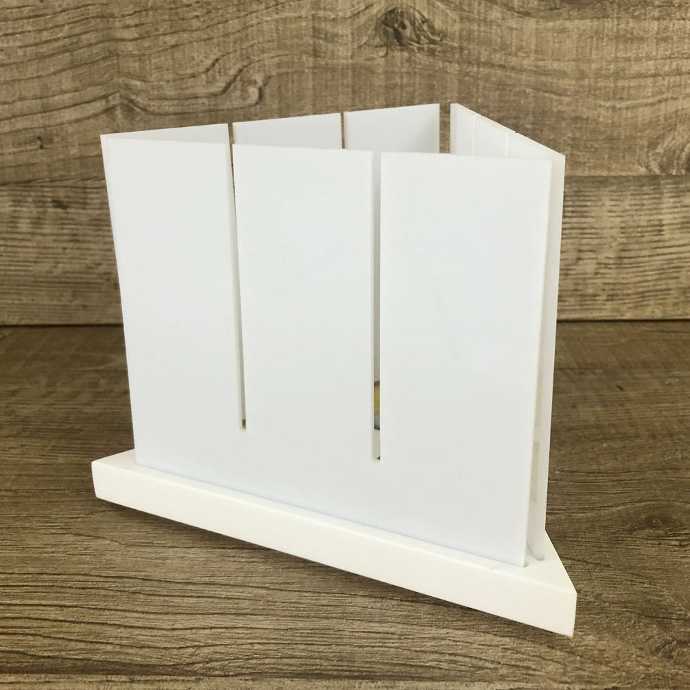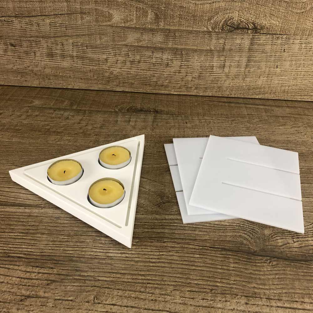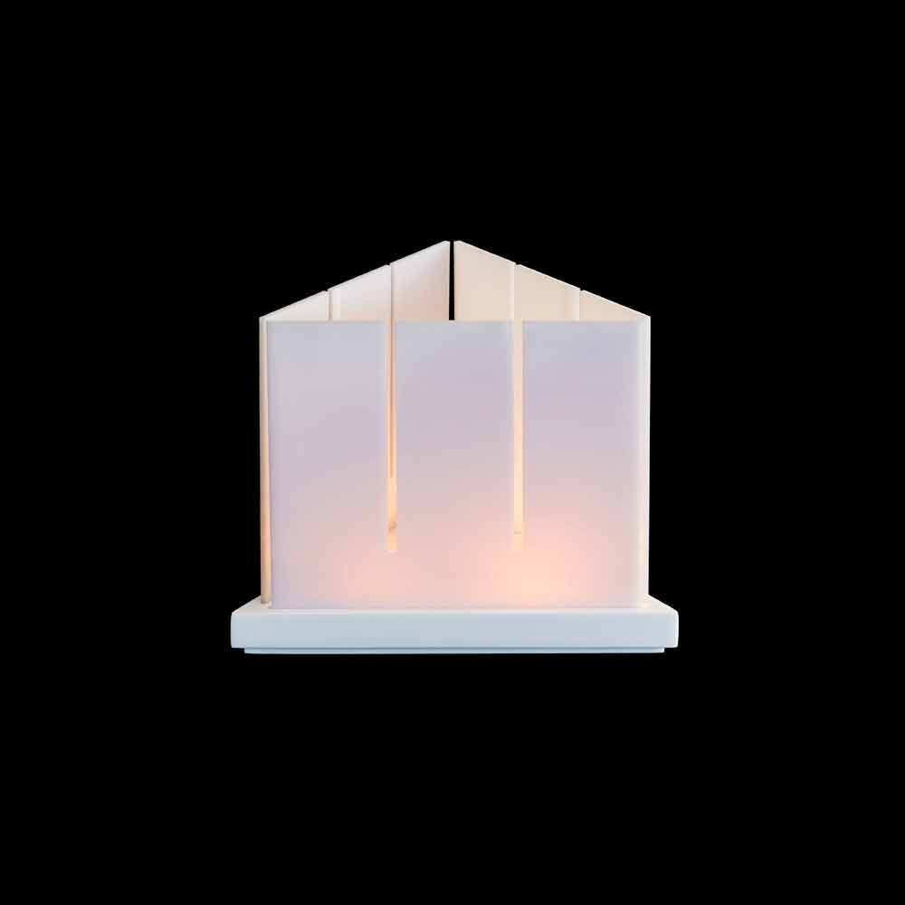 Es handelt sich um eine dreieckige Basislaterne für drei Lichter mit drei abnehmbaren und winddichten „Opal“-Schirmen für ein elegantes und essentielles Lichtspiel.