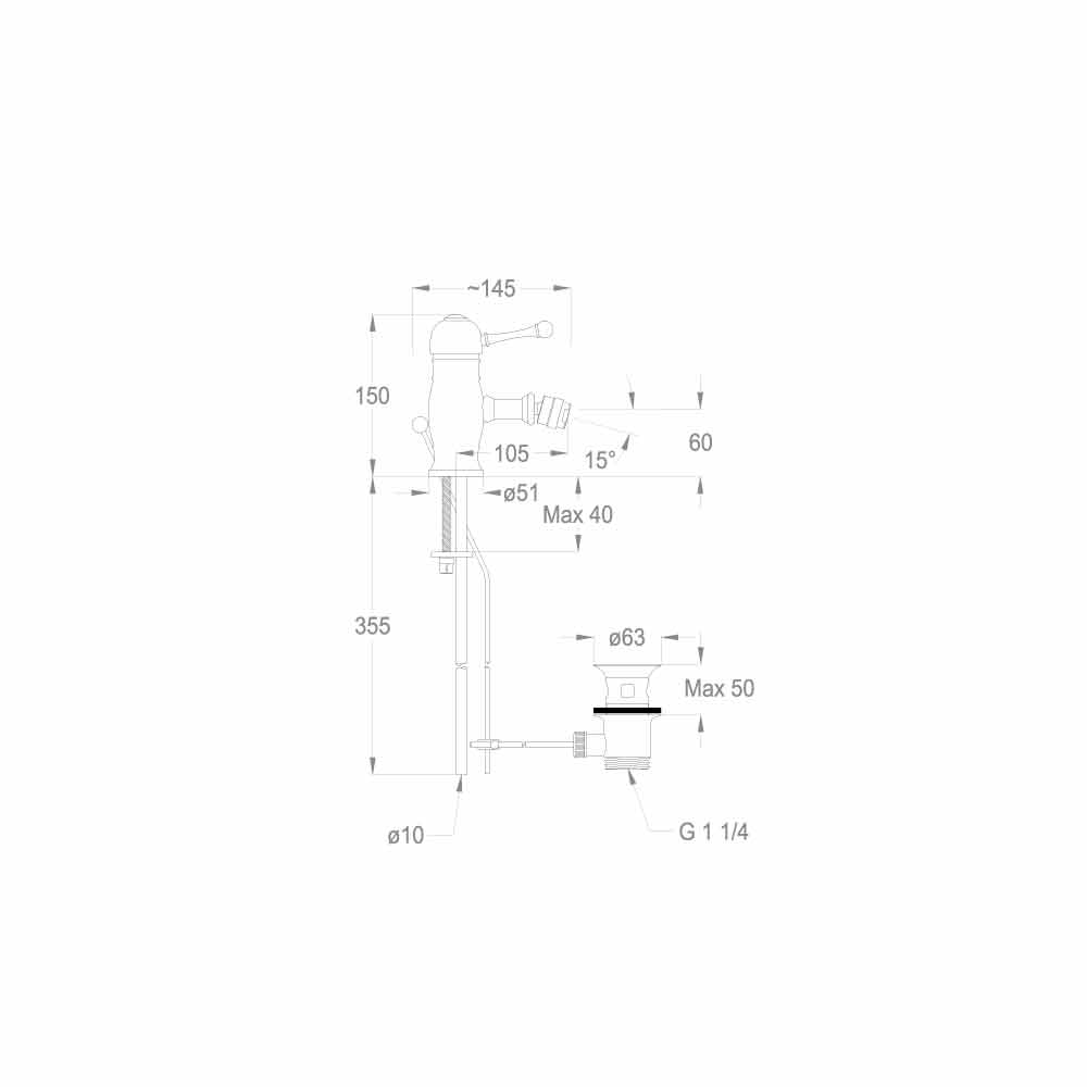 Klassischer Bidet-Mischpult aus verchromtem Messing mit einer Höhe von 150 mm und einem Achsabstand von 105 mm, mit Ablauf und Zugstange. Komplett in Italien hergestellt mit hochwertigen Materialien, die den europäischen Standards entsprechen. Dieser Mischer kann oben installiert werden und ist mit einem einstellbaren Belüfter und einer Keramikscheibenpatrone ausgestattet. empfohlen für sein Energiesparsystem zur Wassereinsparung von 6 l / min und für seine starren Anbaugeräte.