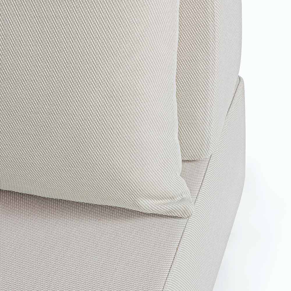 Sitze, Rückenlehnen und Kissen mit abnehmbarem Bezug aus Olefingewebe für den Außenbereich (100% Polypropylen, 285 g / m2), wasserabweisend und UV-beständig (Klasse 7), innen wasserdicht mit Stoffbeschichtung (Polyurethan). Polstersitz aus Polyurethanschaum (38 kg / m3), Rückenlehne (20 kg / m3).