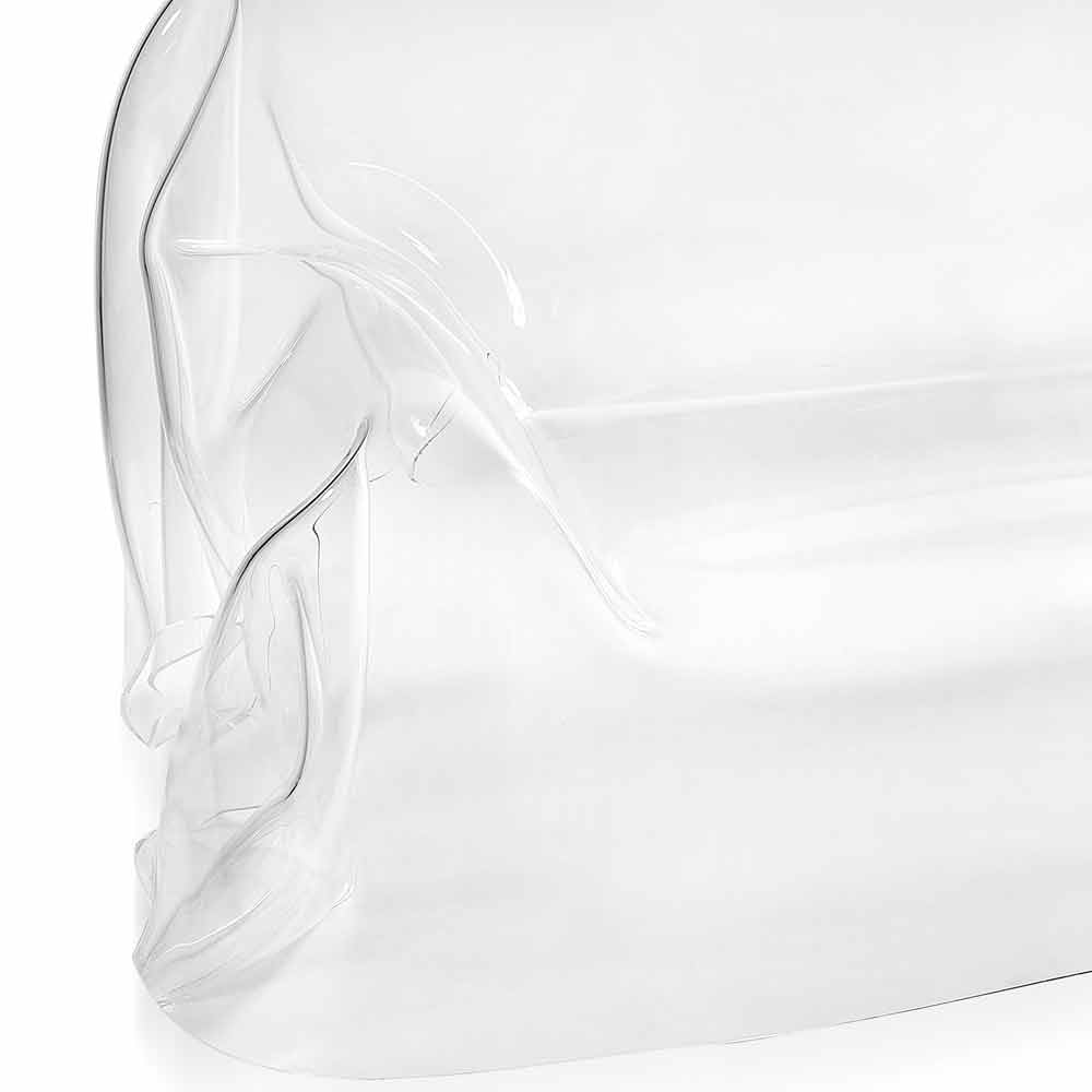 Das drapierte Sofa Jolly ist ein Unikat. Aus einer 100% reinen Polymerfolie aus transparentem PMMA-Plexiglas, vollständig von Hand drapiert, entsteht ein einzigartiges und unwiederholbares Sofa. Die gebaute Struktur ist völlig selbsttragend und bietet Platz für 2 Personen. Die physikalisch-technischen Eigenschaften von Plexiglas (stoßfest, nicht verformbar, unveränderlich, wärmeisolierend) machen diesen Artikel zu einem praktischen und funktionellen Möbelstück, das für jede Umgebung geeignet ist. Die Helligkeit und Helligkeit werden über die Zeit konstant und unverändert beibehalten. Das PMMA Plexiglas aus reinem Polymer ist ungiftig, hypoallergen, geruchlos und antibakteriell. 100% recycelbar. Entworfen, entworfen und hergestellt in Italien, mit italienischen Materialien.